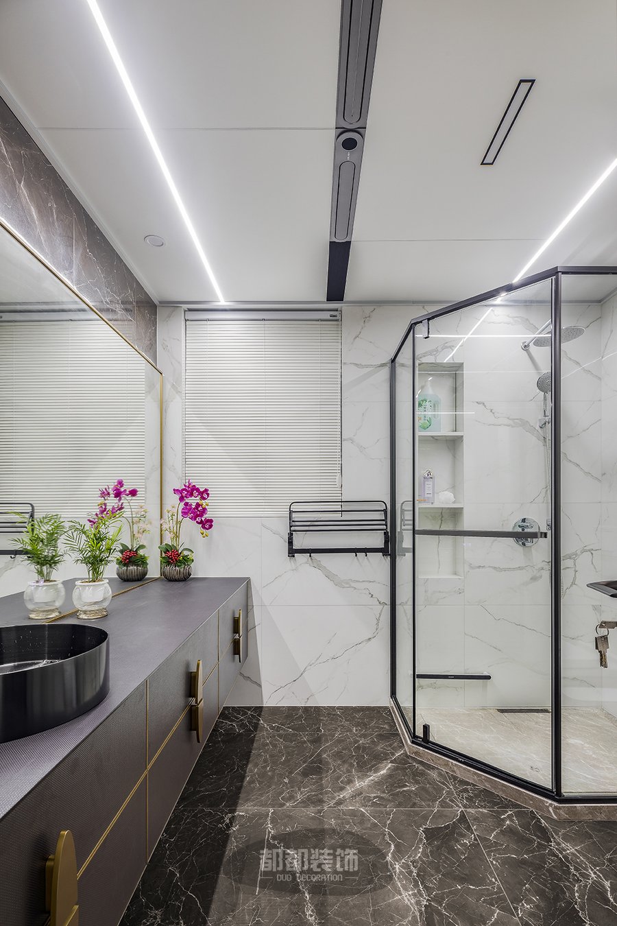 卫生间干湿分离,因空间中没有自然光源,所以安装玻璃推拉门隔断,使空间更加明亮通透,保持空间的通透性;整体现代前卫,墙面以黑白纹理搭出设计感;化妆镜是整个大面设计,洗漱、装扮随性所欲,大理石瓷砖细腻的纹理如闻翰墨飘香,突出现代美。