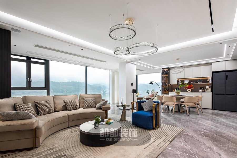 客厅整体风格偏向柔和,与吴女士本身的女性气质暗自呼应,喜欢慵懒氛围的吴女士不喜欢条条框框的限制,更倾向于流畅舒适的空间,全开放的布局餐厅和客厅之间没有隔墙,减少了两个功能区的隔阂。