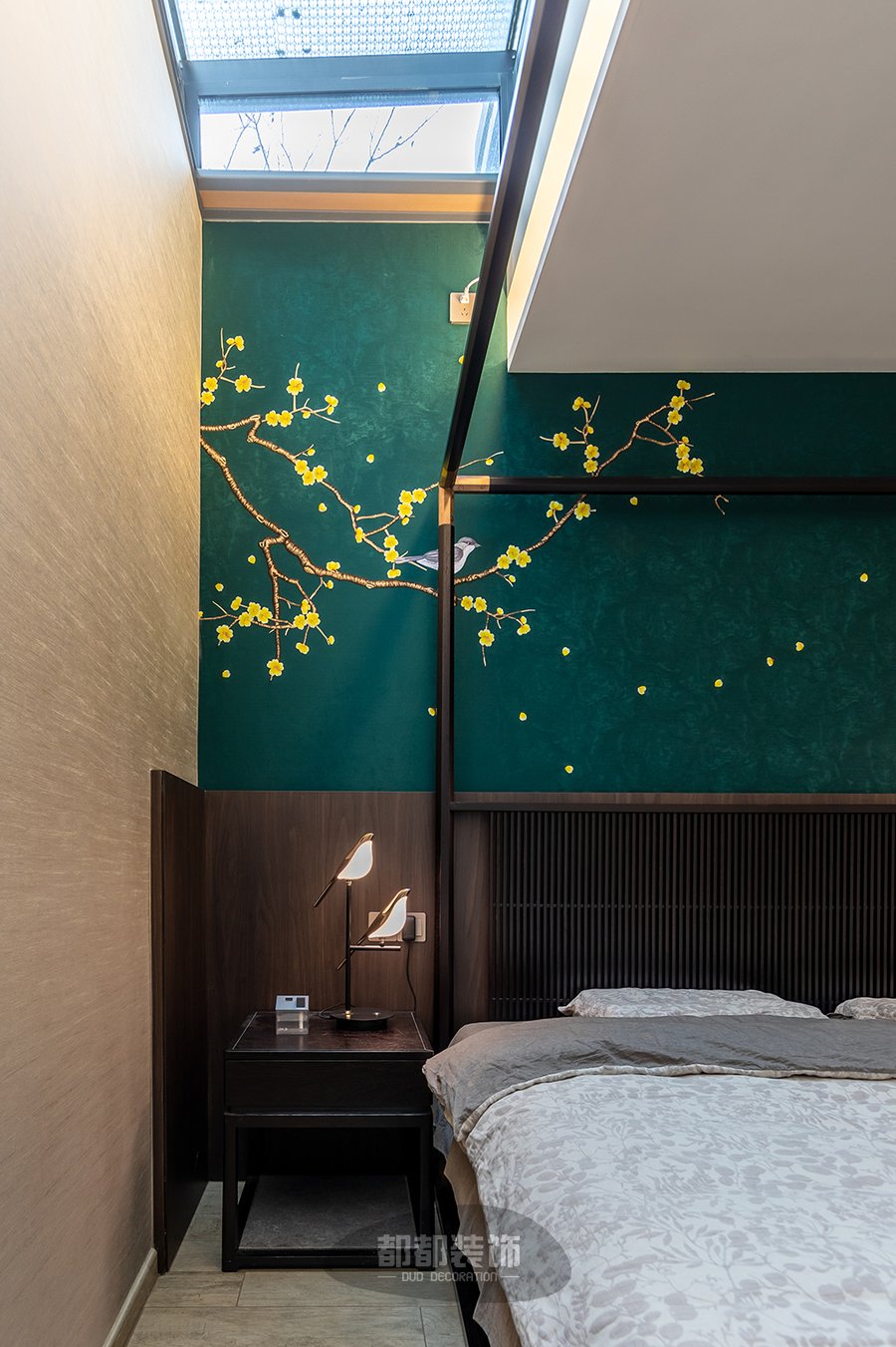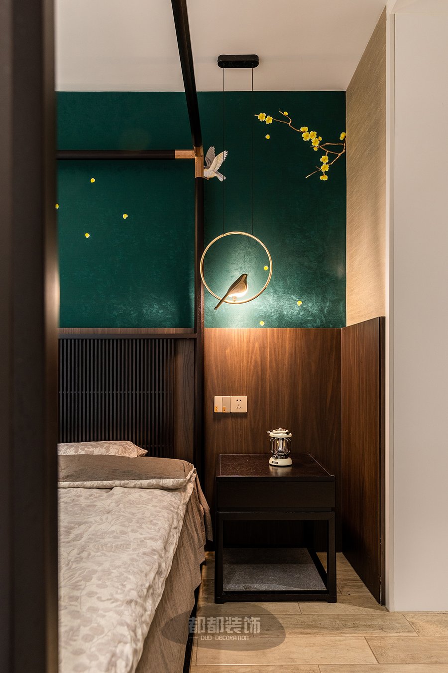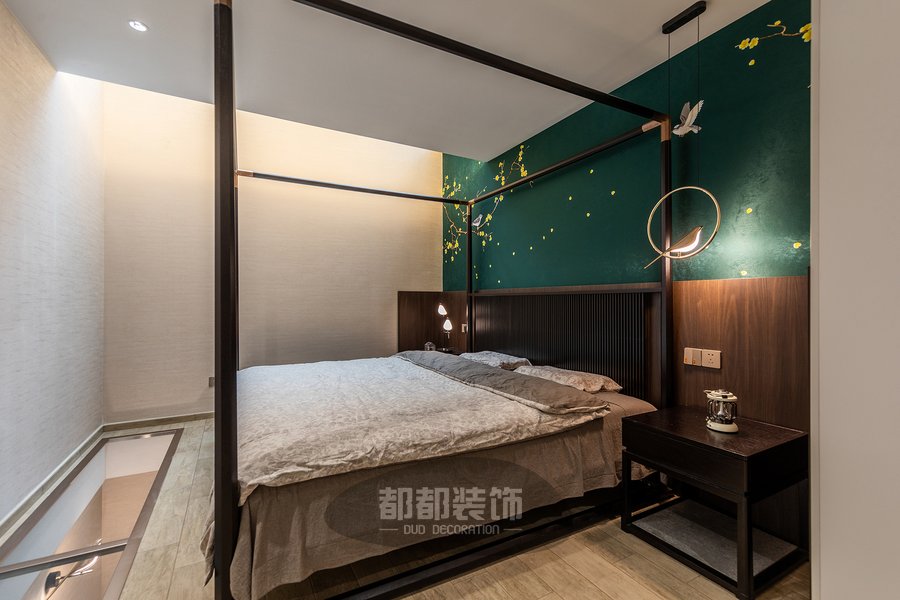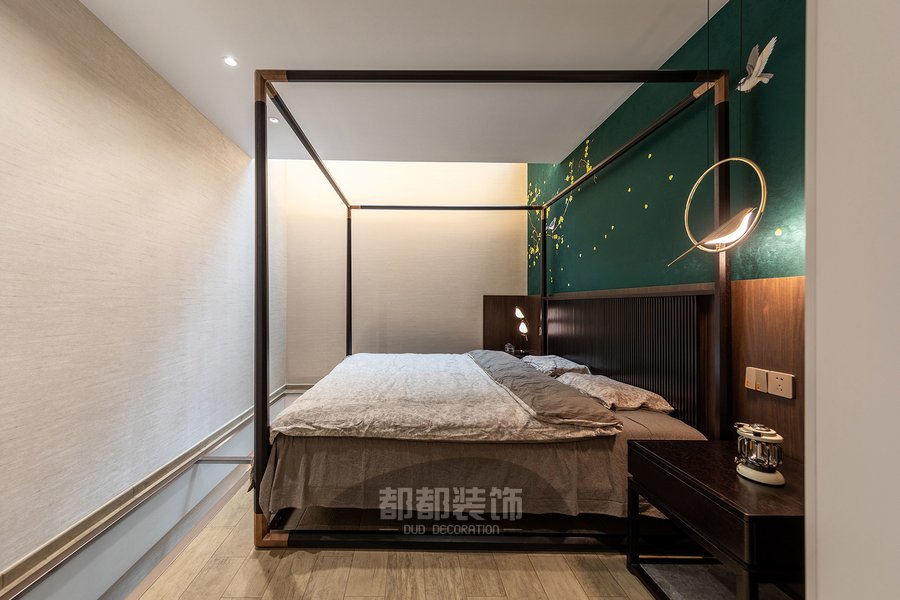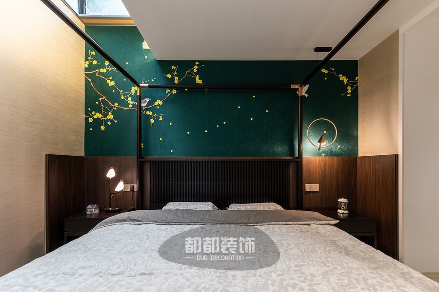 卧室的每个细节上流露着丝丝入扣的文化底蕴,墨绿色背景中点缀嫩黄腊梅花,犹如江南四季如春,马蹄溅起诗意,让春风一吹,便可闻到爱的淡淡花语。