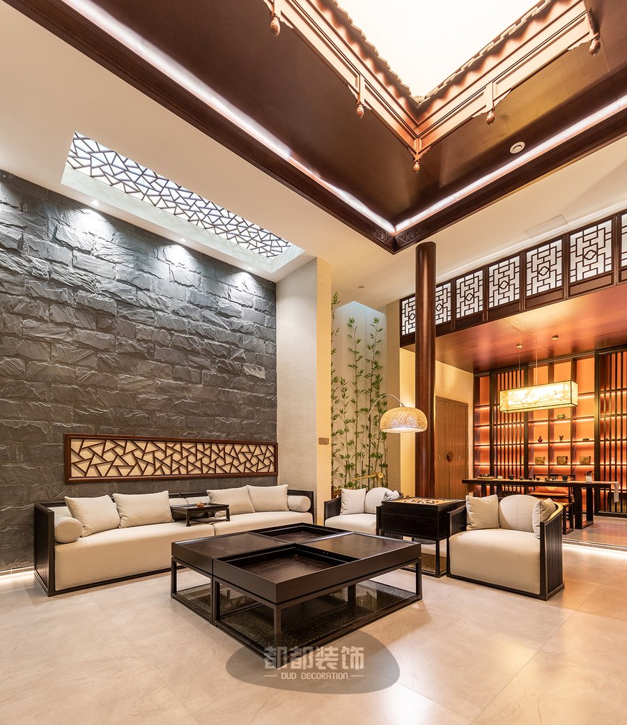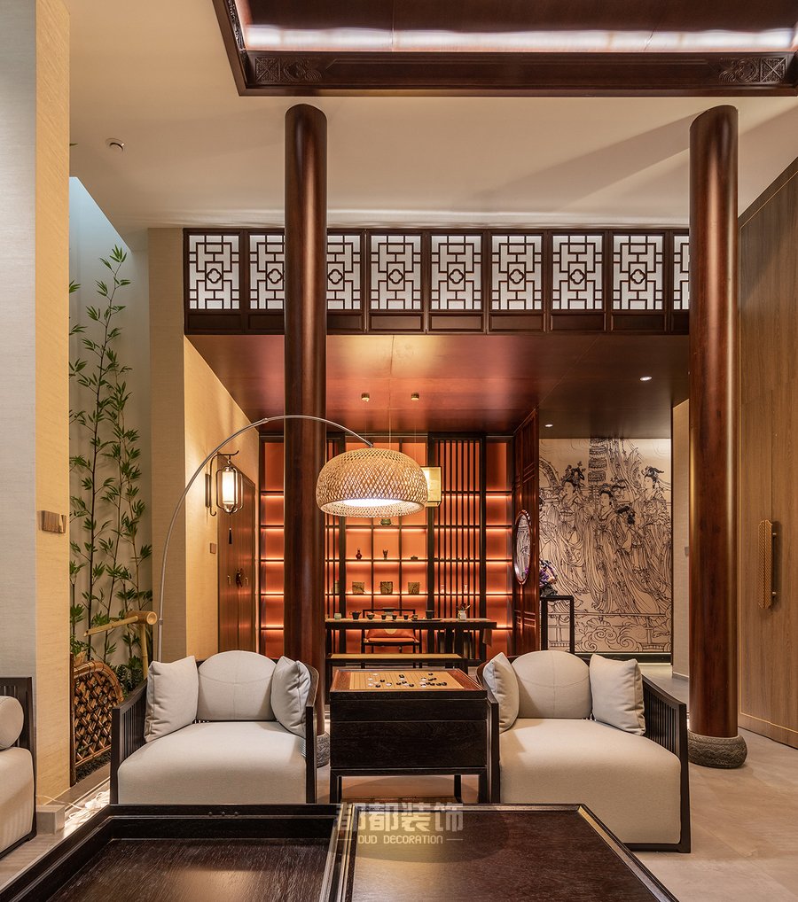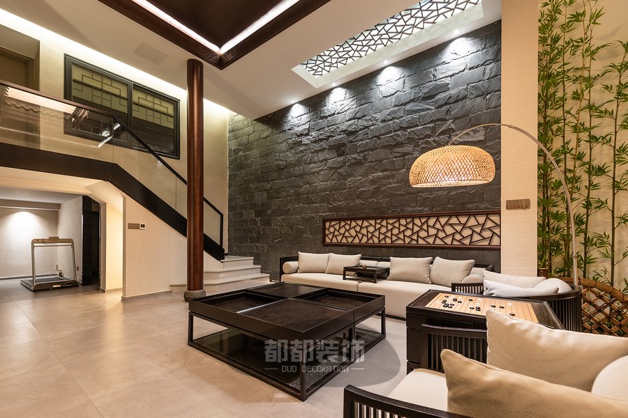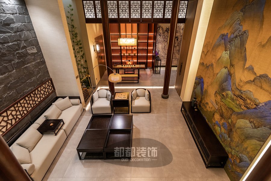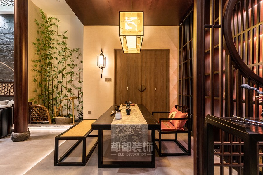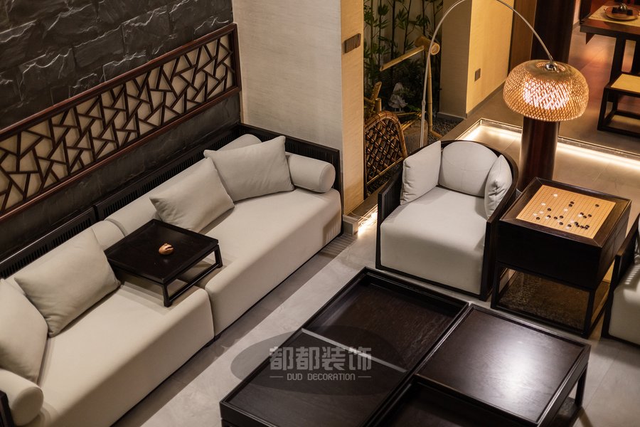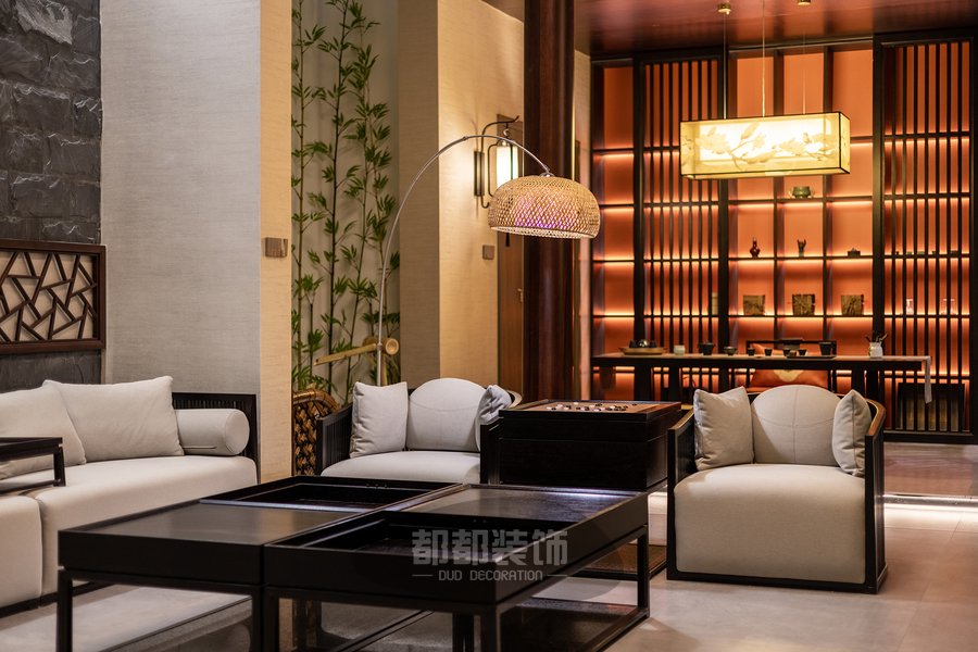 负一楼的禅茶室与会客厅,隔而不断,气韵相通,微弱的地台高低差自然的将屋主的专属品茶空间和会客厅两个区域稍作区隔,让空间看起来更宽敞。