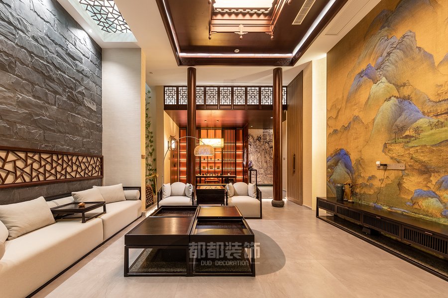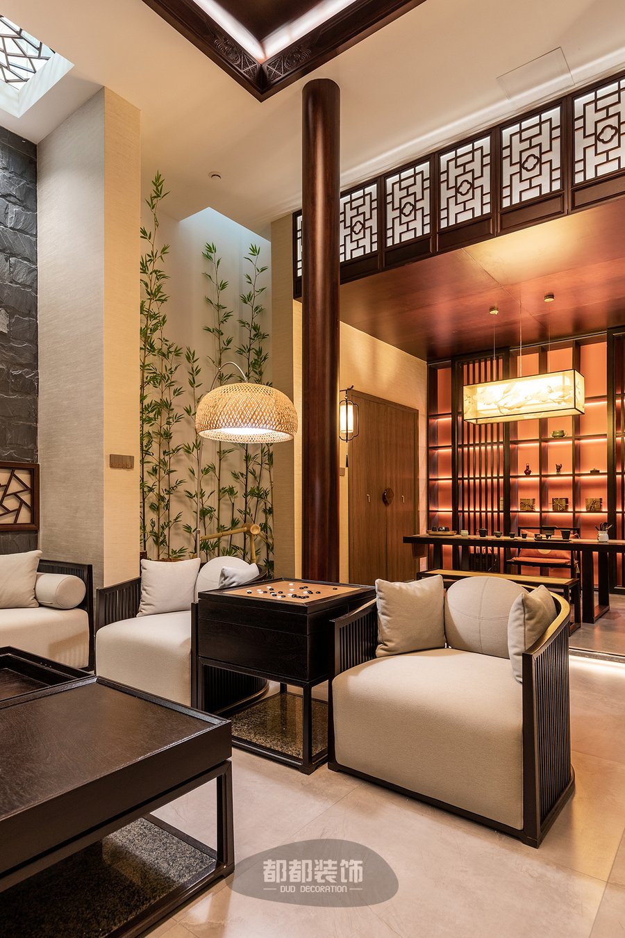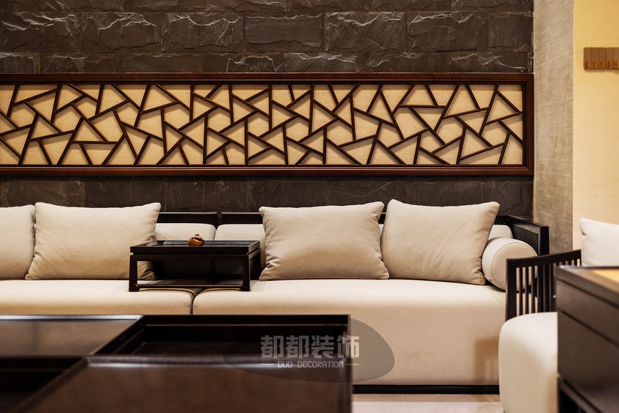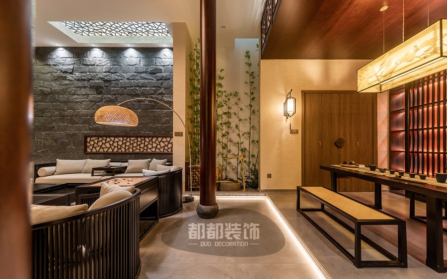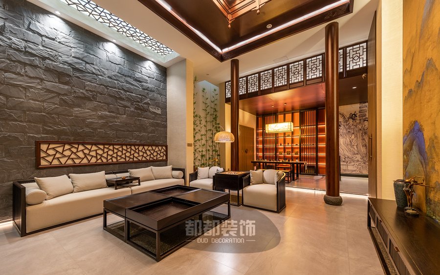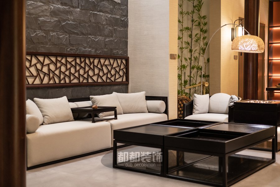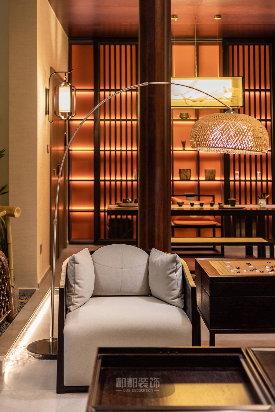 负一楼的禅茶室与会客厅,隔而不断,气韵相通,微弱的地台高低差自然的将屋主的专属品茶空间和会客厅两个区域稍作区隔,让空间看起来更宽敞。