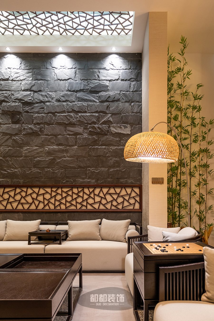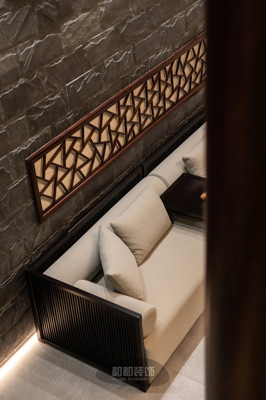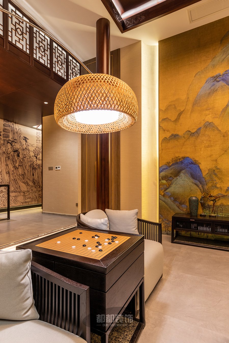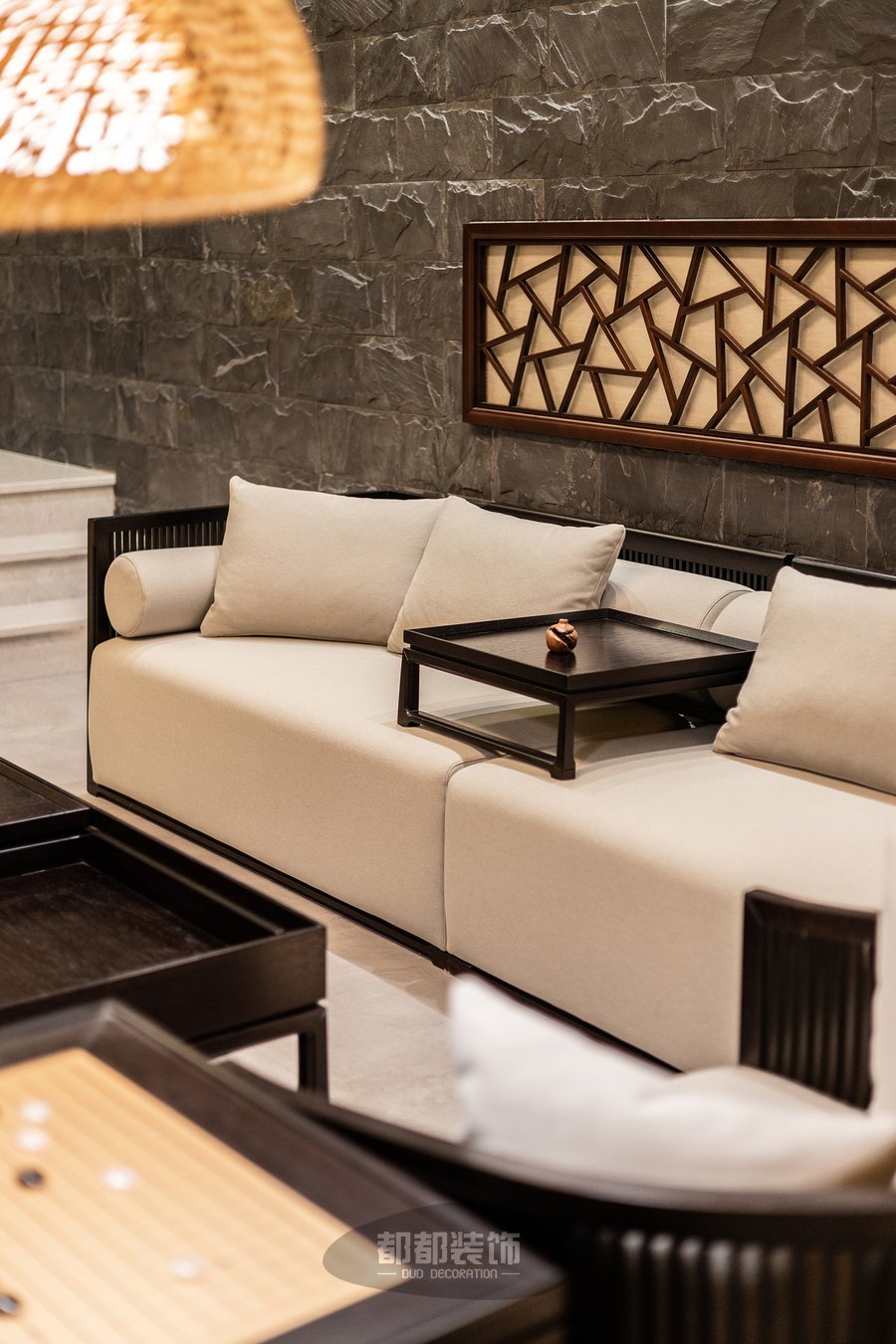 负一楼的禅茶室与会客厅,隔而不断,气韵相通,微弱的地台高低差自然的将屋主的专属品茶空间和会客厅两个区域稍作区隔,让空间看起来更宽敞。