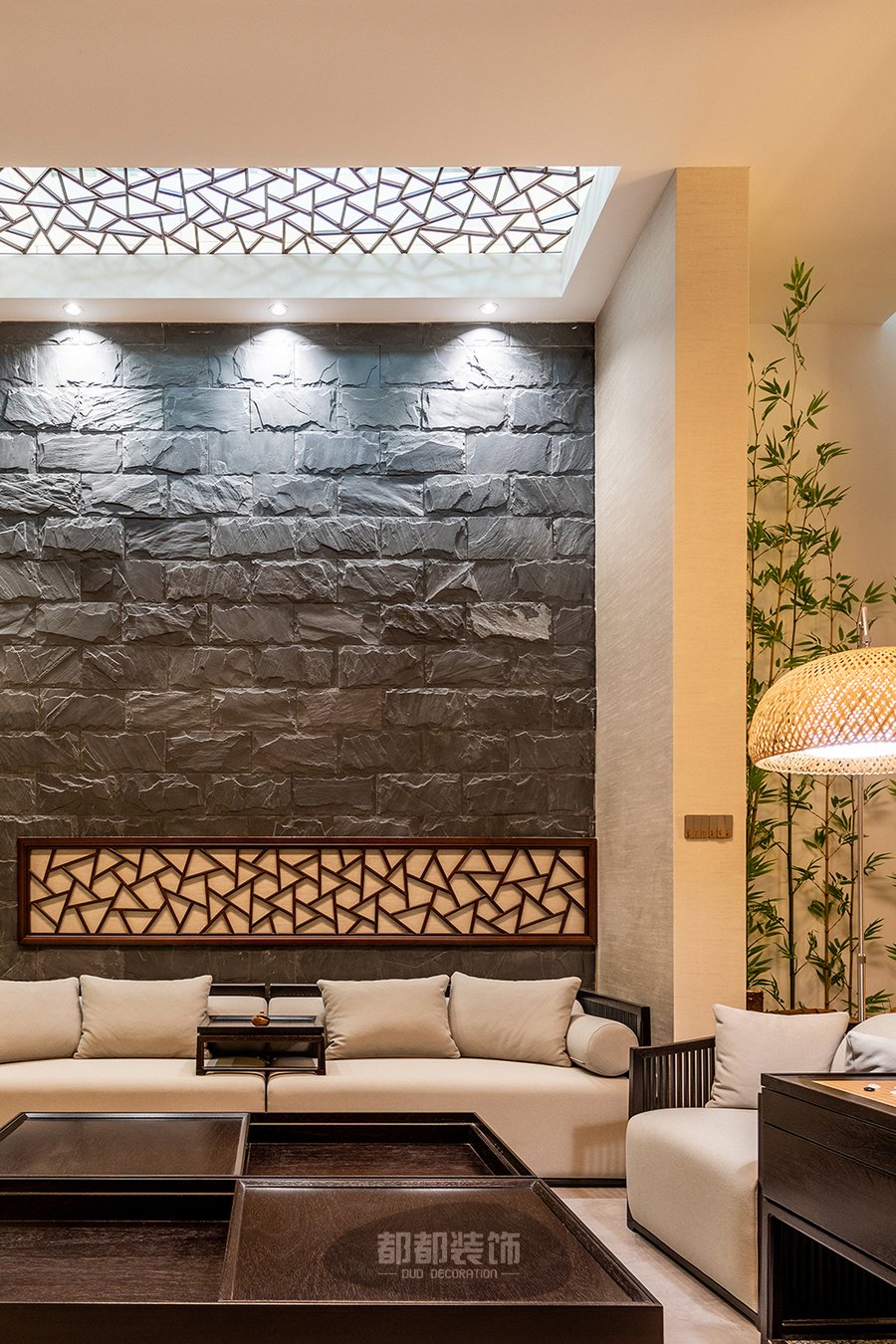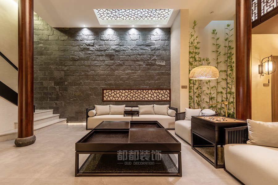 业主希望回到家是放松安静的一个状态,空间多以自然材料,绿植妆扮,给人以自然零距离感,软装上除了实木家具,加入一些中国画、瓷器、盆栽、石墙等一些中式元素进行装饰,在点线、面的设计法则下整体空间既和谐统一,又不失趣味。