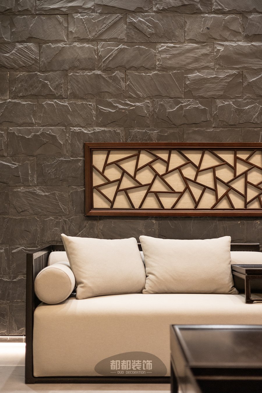 灰色大理石地板与清一色古典木质家具,取材于自然呈现清新纯粹的空间质感,中式石砌背景墙体现了传统与现代的有机结合,呼应了整体风格,又满足了现代居住的需求。
