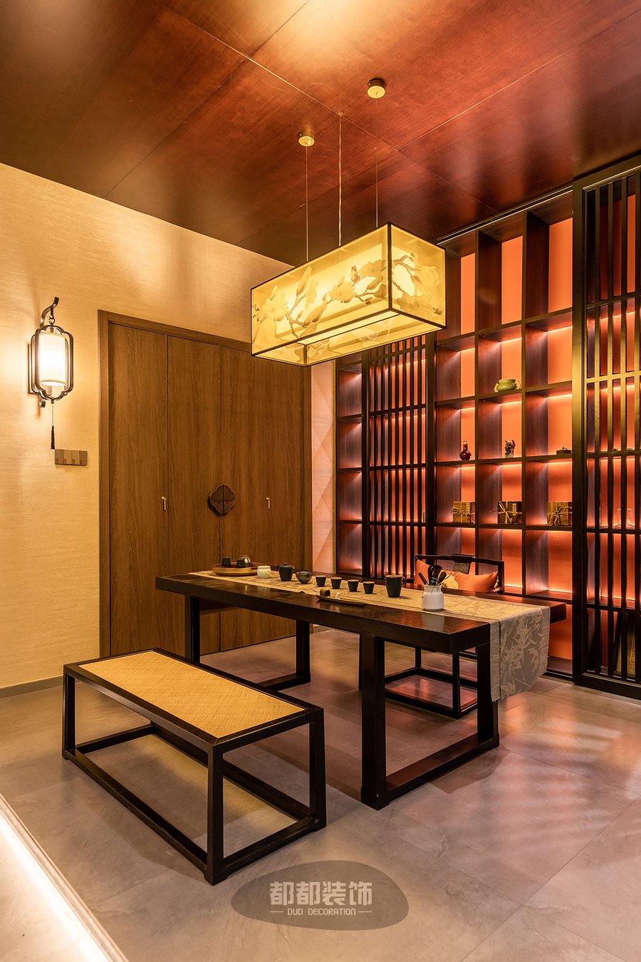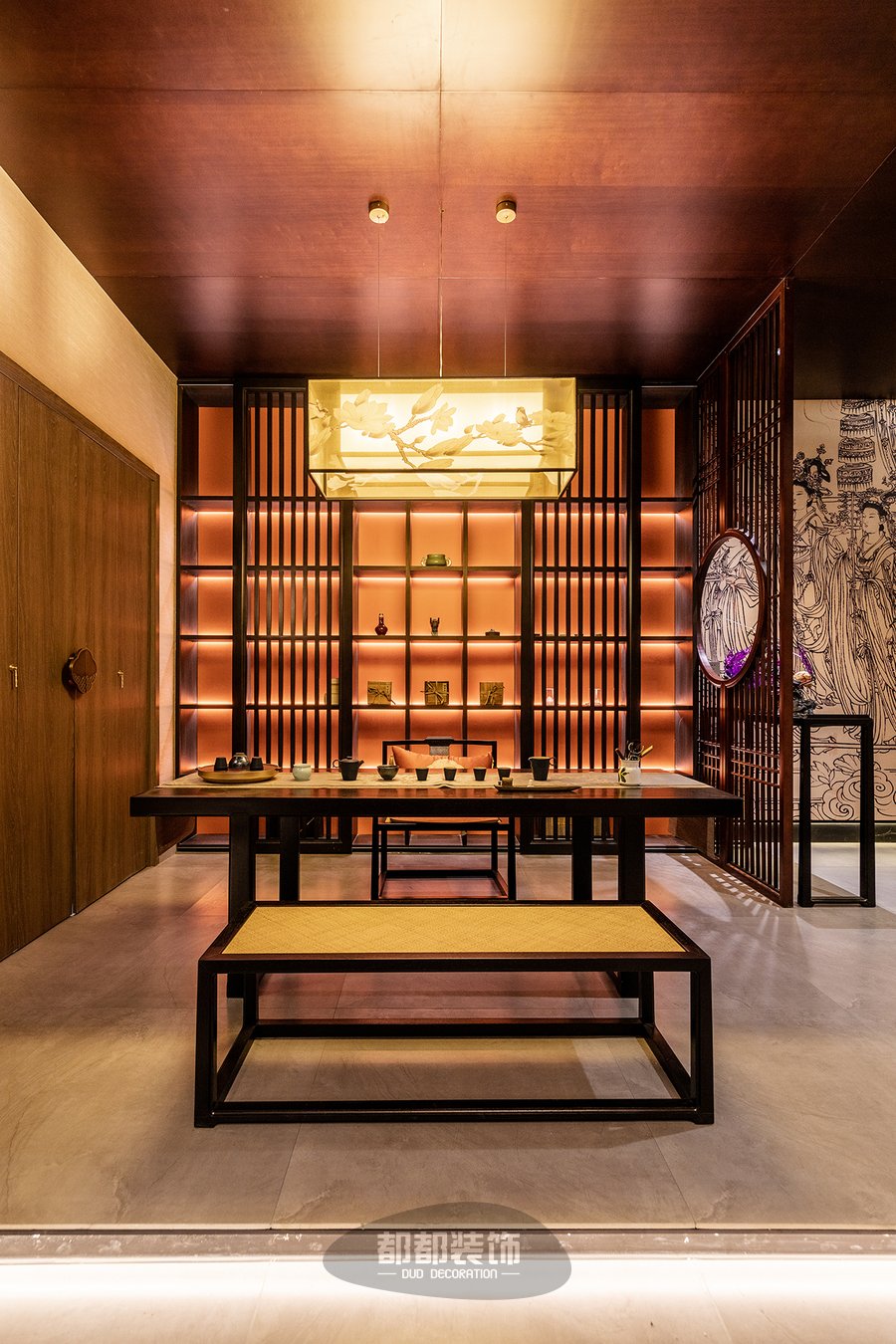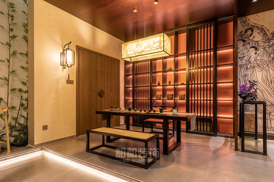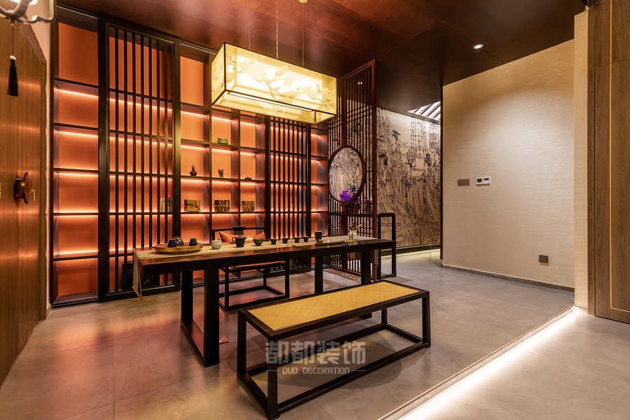 暖红调的灯光布局,让人由内而外的感受到茶室的静谧安宁,胡桃木色定制柜体搭配黑檀木茶桌茶椅,实木自然的纹理搭配黄色薄纱吊灯,空间立显高级奢华,鲜明的层次,带来视觉的舒适,仿佛来到了茶具展览馆。