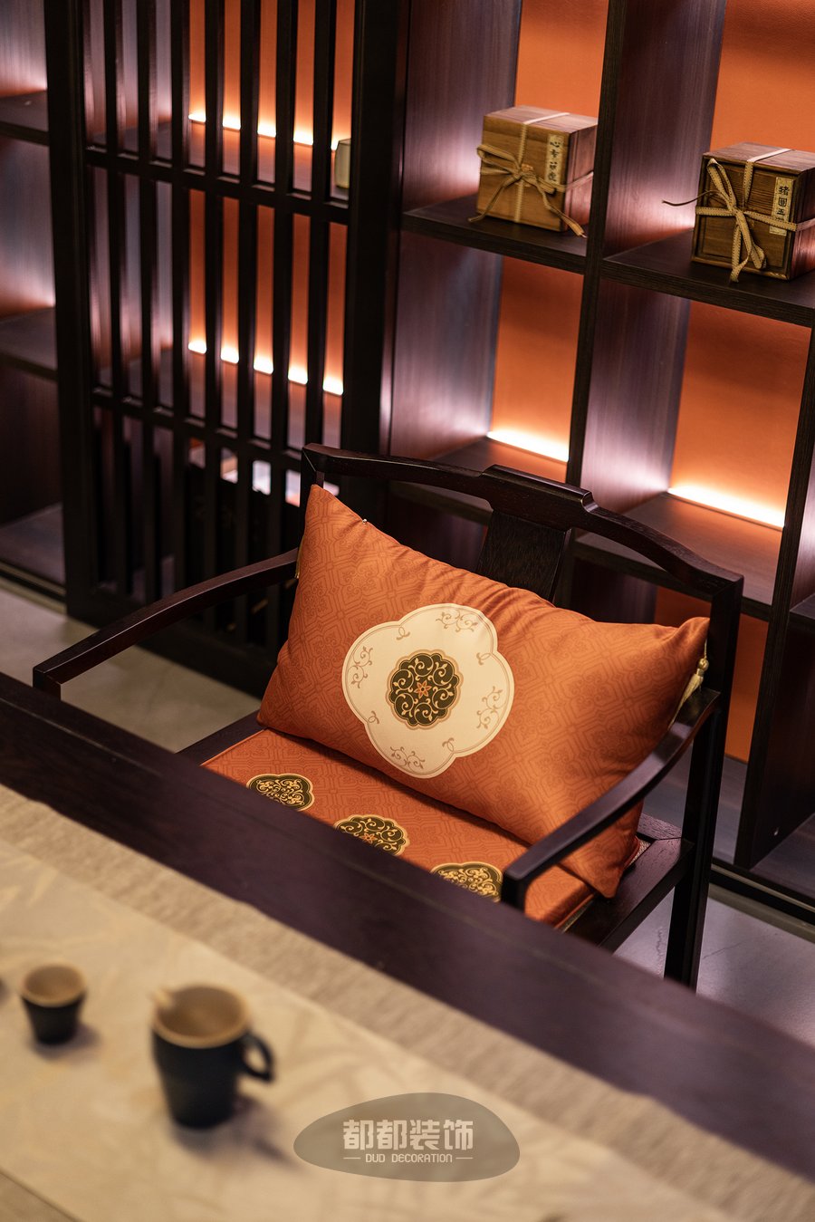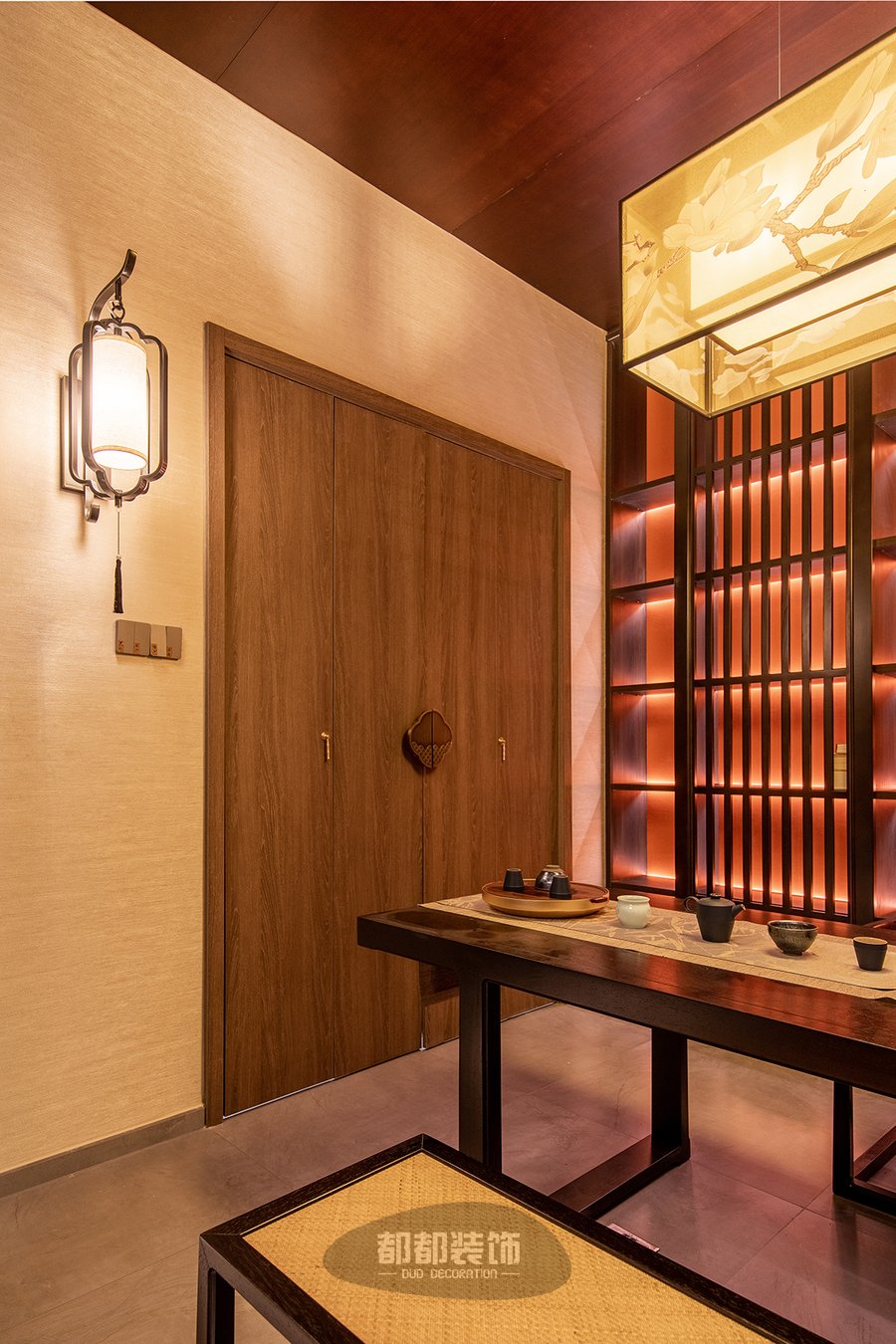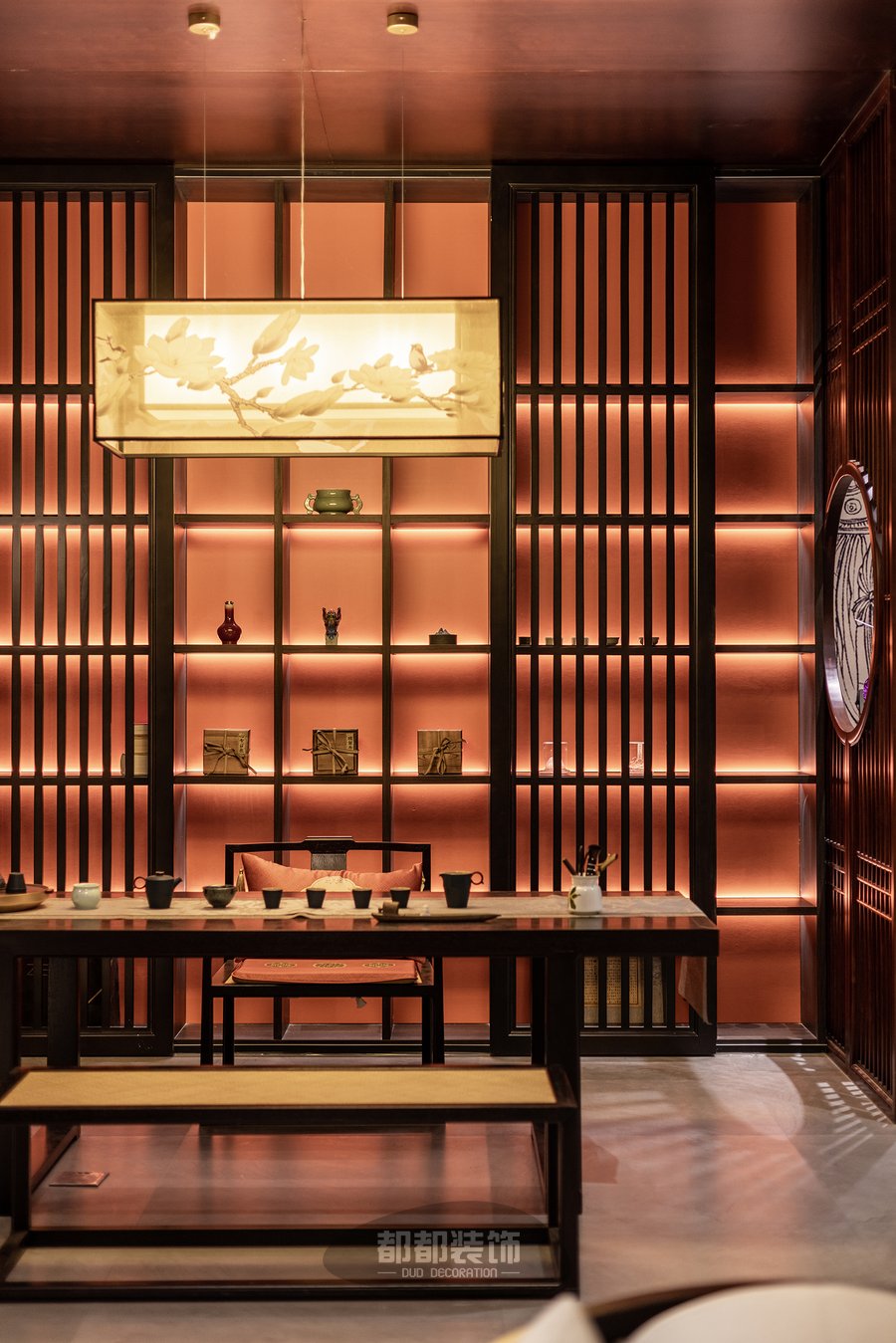 暖红调的灯光布局,让人由内而外的感受到茶室的静谧安宁,胡桃木色定制柜体搭配黑檀木茶桌茶椅,实木自然的纹理搭配黄色薄纱吊灯,空间立显高级奢华,鲜明的层次,带来视觉的舒适,仿佛来到了茶具展览馆。