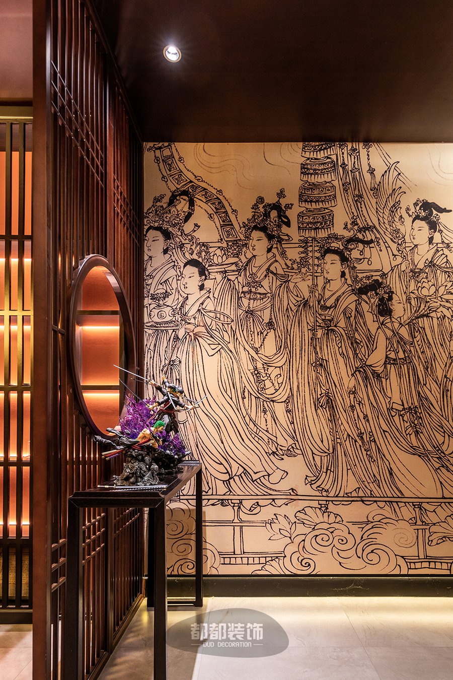 由于业主从事游戏人物刻画的工作,因此房屋主人对中国画的设计与装饰有着浓厚的热爱,他们认为有气质的玄关空间并非奢华装饰的堆砌,古老简素的色彩更有文化的沉淀感,玄关两侧画中的仕女神态生动,可谓清丽秀雅、别有风姿,如诗般优雅。
