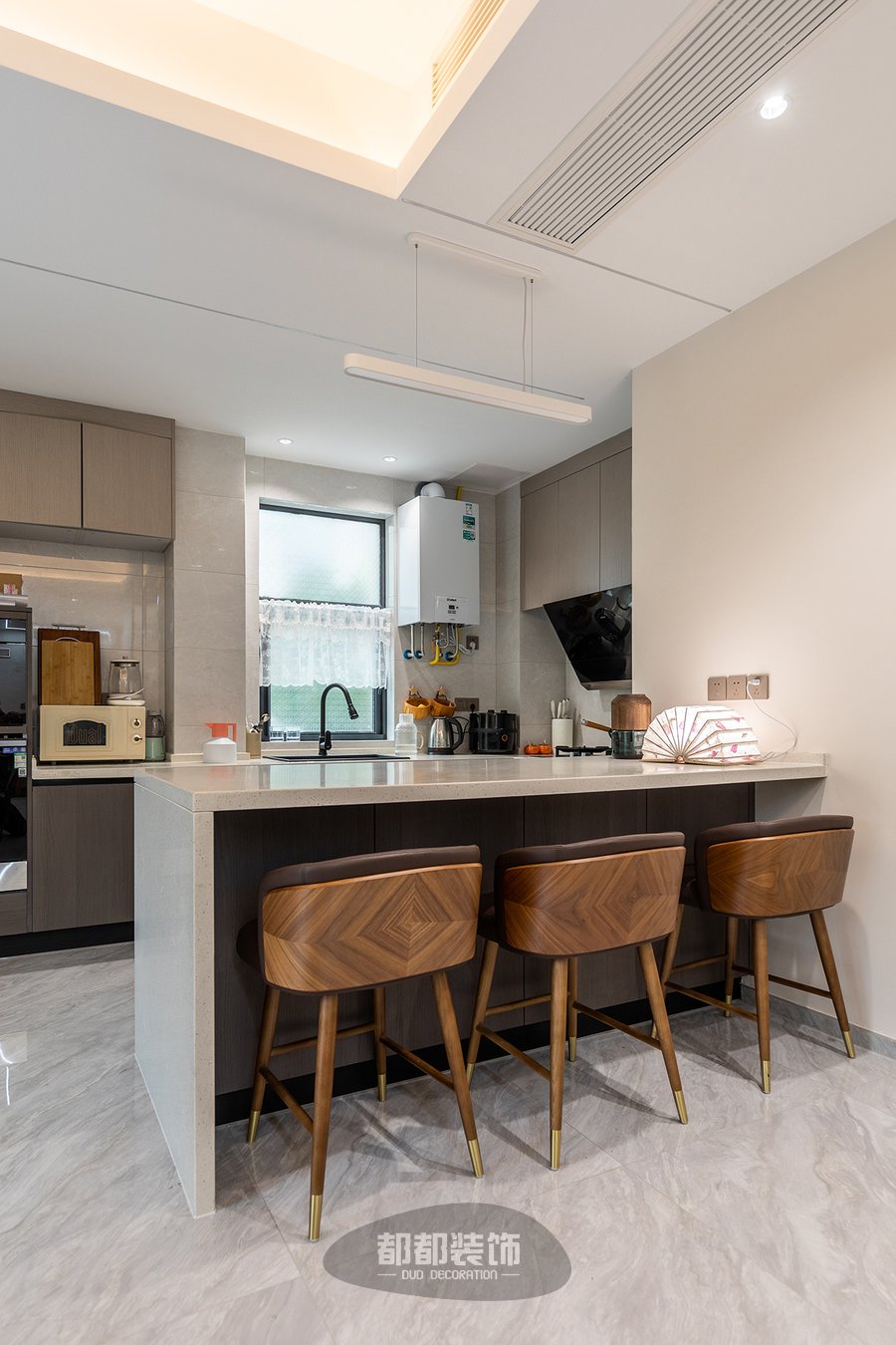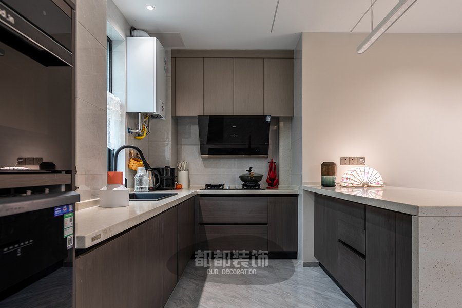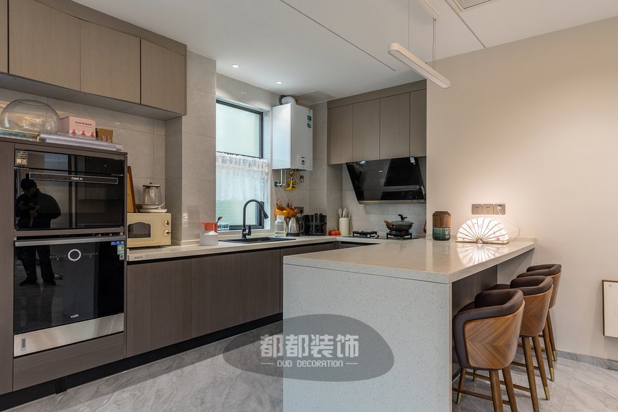 开放式厨房布局有强大的收纳功能,大容量的地柜和壁柜,很好的解决了厨房容易凌乱的问题,这个看似不起眼的1㎡吧台,却藏匿着关于生活的小确幸,能缓解操作空间不足的不便,更是促进情感沟通、提升家居情调和幸福感的必杀技。