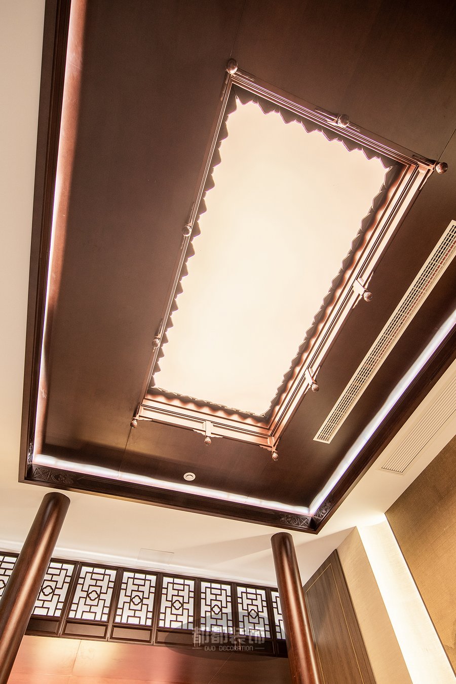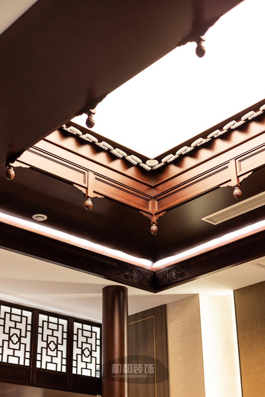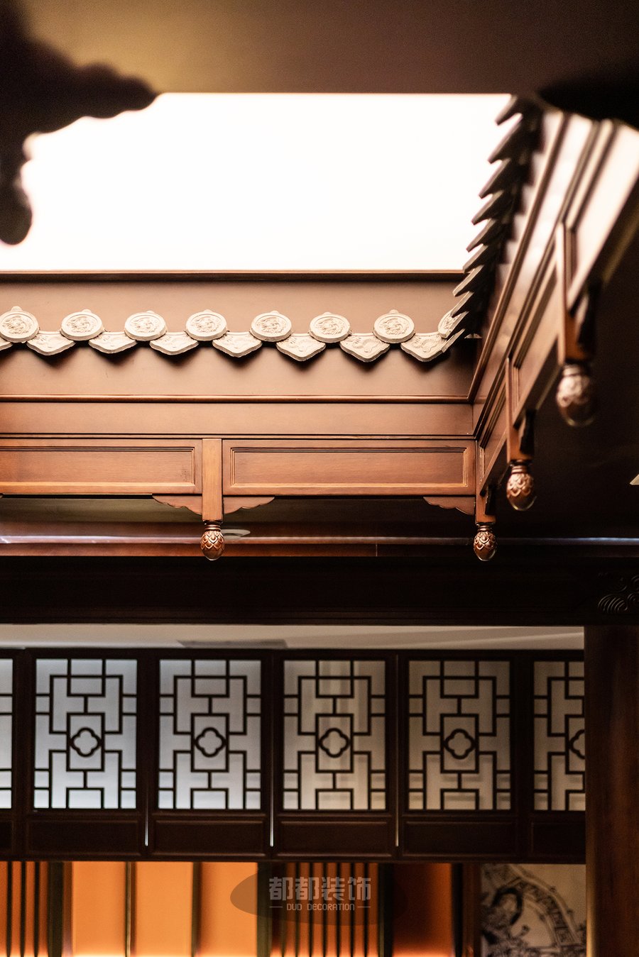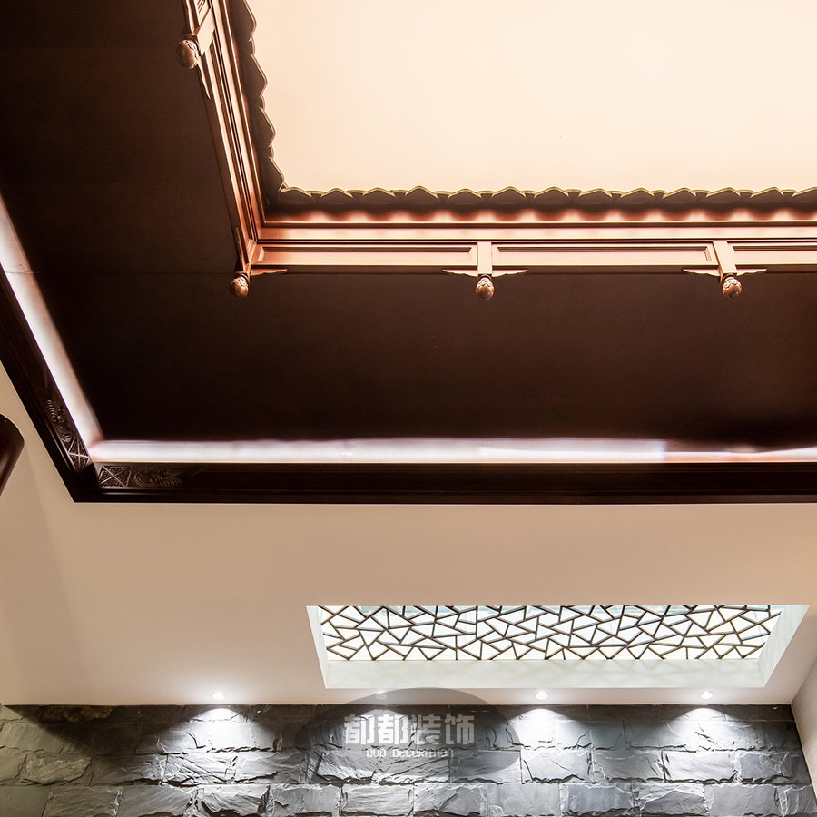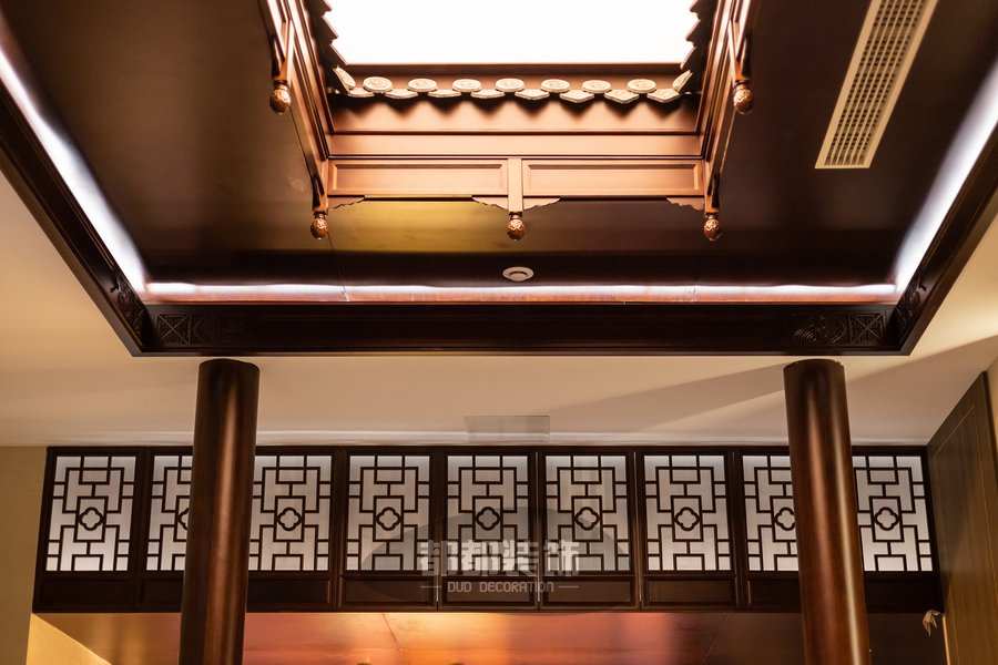 天井旁的假窗让人的联想到外面不同的世界,古典的中式镂空窗在视觉上制造空间的延伸感,温润的实木雕刻承载着飘逸酣畅的精细纹理,韵味悠长。