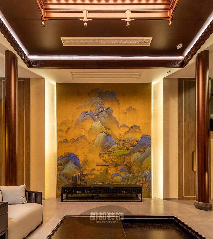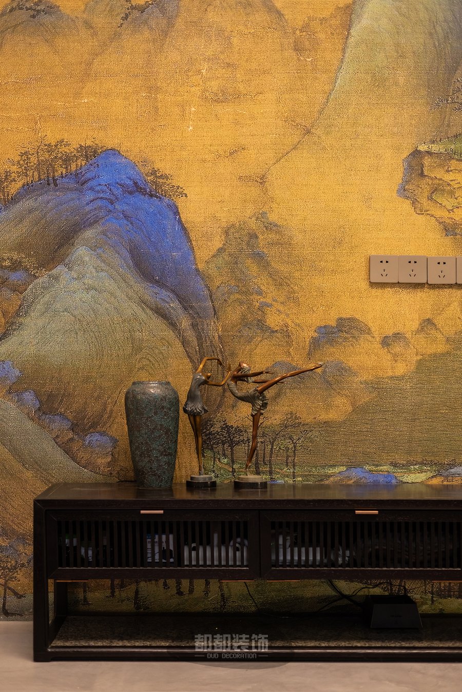电视墙面以山水国画为主,丹青妙笔描绘出的高山湖泊,清波万顷,当一袭碧色于水中渲染,姿态变幻,勾勒出生活的惬意纯净,禅意花瓶搭配黑胡桃木电视柜给人—种贵气、雅致的感觉。