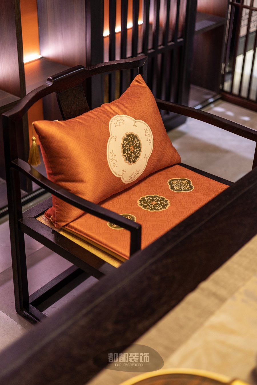 精雕细琢的镂空压花,严谨的构图和线条,以大气的棕红色家具为主体,搭配米色沙发垫,让整个空间大气与灵动兼具,身处其间仿佛置身于古代的大户人家。