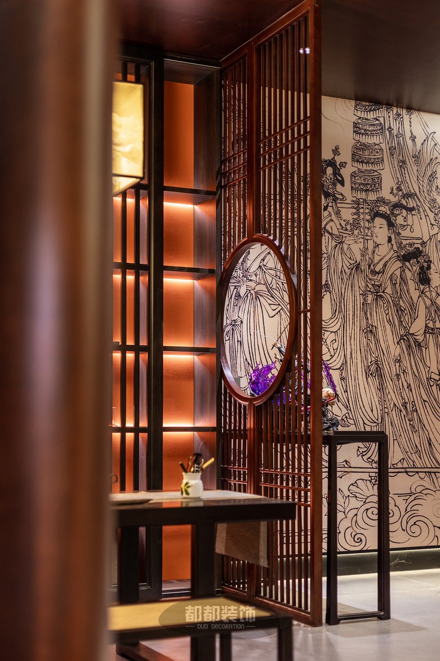 玄关台以木质为主,入户通过格栅屏风隔断空间,造型典雅,硬朗简洁的直线条让空间更有层次感,亮紫色玉石与胡桃木碰撞,造就了优雅复古的梅花造型, 仿园林的洞窗+复古摆件互相映衬,传递出浓浓的东方审美韵味。
