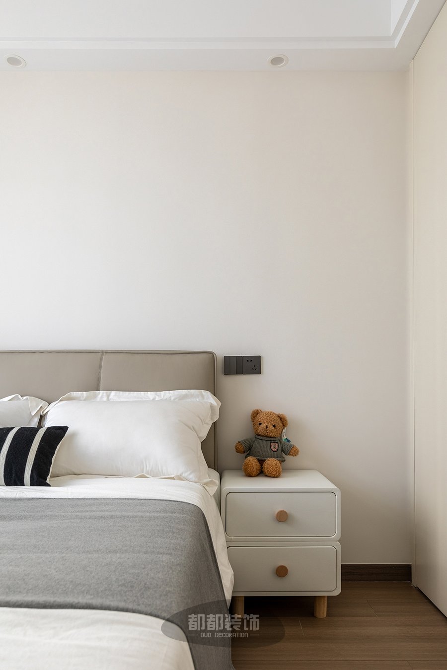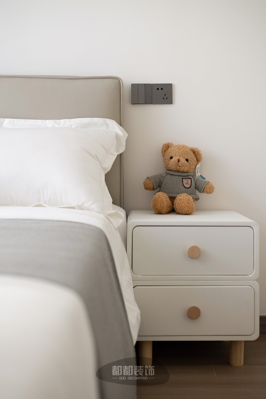 床头一侧放置着乳白色床头柜,精美小巧更像是装饰品,干净整洁的台面会给人一整天的愉悦好心情,维尼小熊让卧室更有温馨氛围。