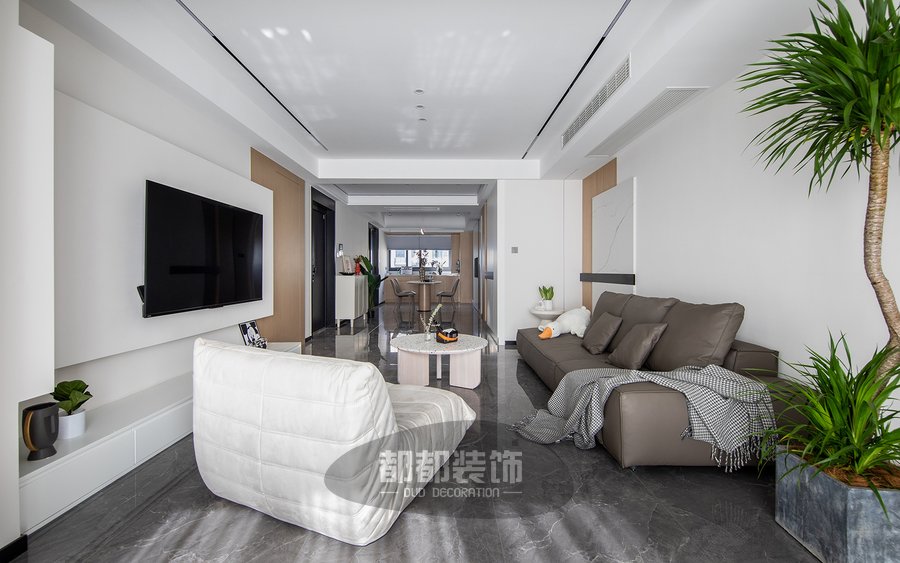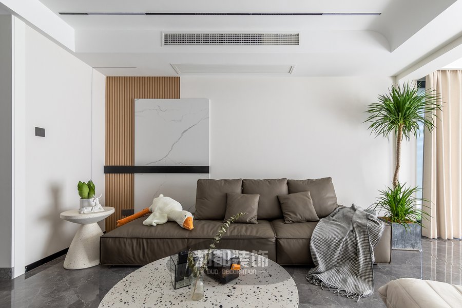 块状沙发的靠背可随意组合,弱化了深色系软装的厚重感,呼应空间简约清爽氛围,高级棕的选色,让客厅一下有了视觉重心,色调搭配张弛有度。