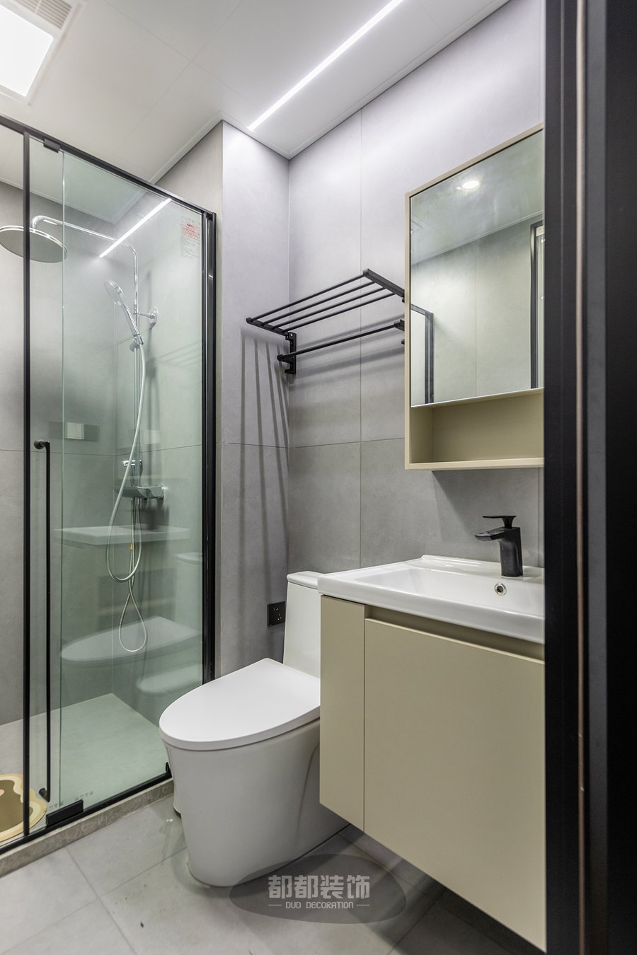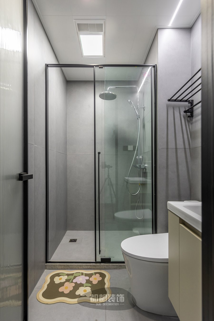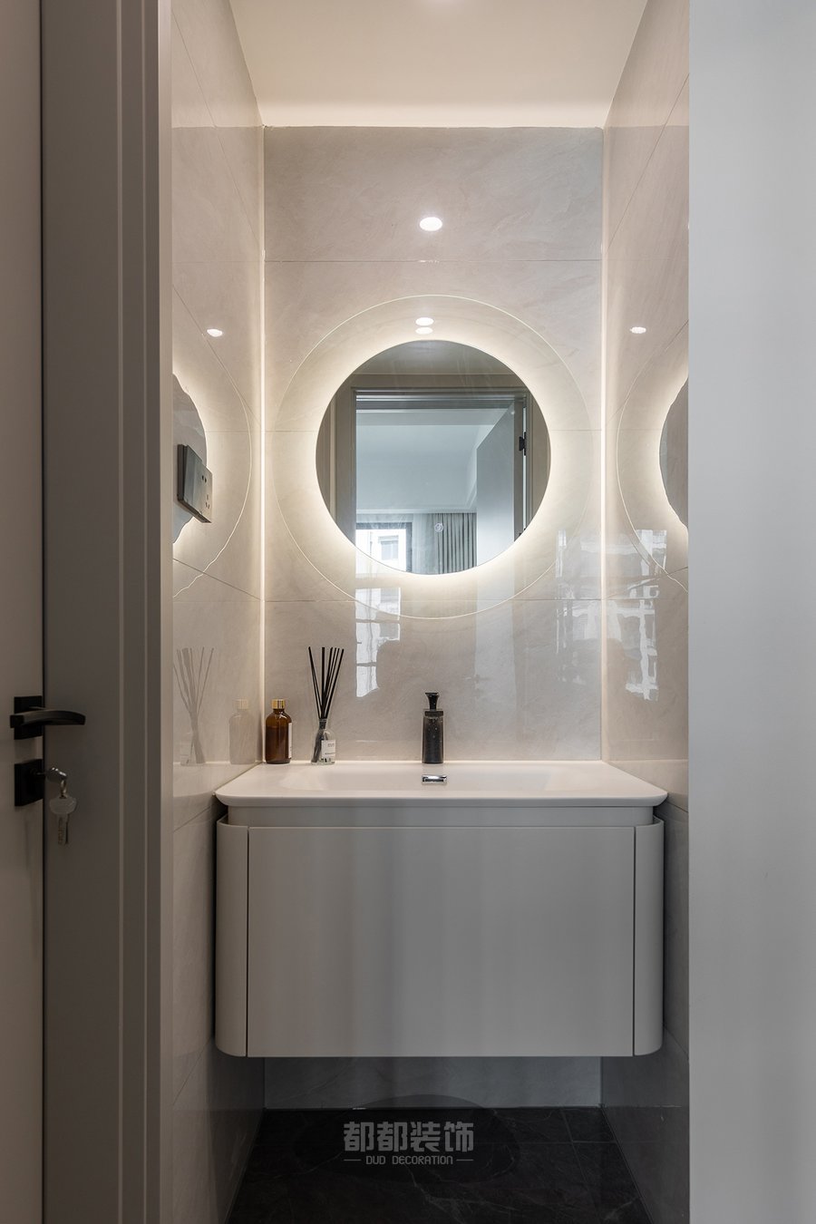 卫生间选择一体式洗手盆,方便打理清洁,下方的悬挑抽屉将洗漱备用品收入其中,圆形化妆镜背面镶嵌整圈灯带,超有深秋明月的凄冷氛围,马桶区上方做出的置物架,演绎空间极致利用法则,增加卫生间收纳之地,淋浴区进门处铺设一方可爱定位花朵防滑地垫,切实保护家人安全。