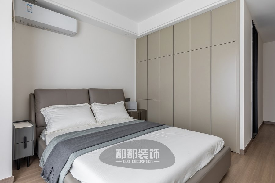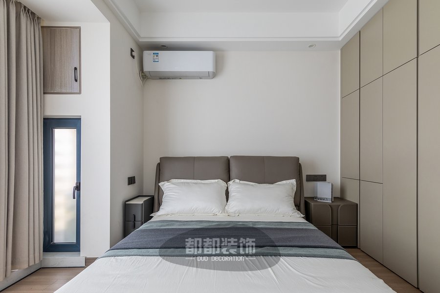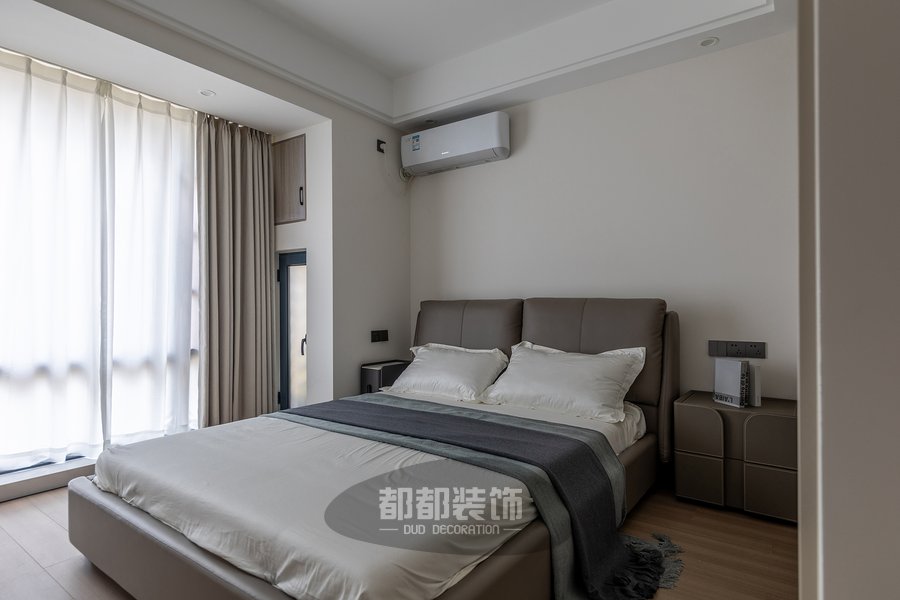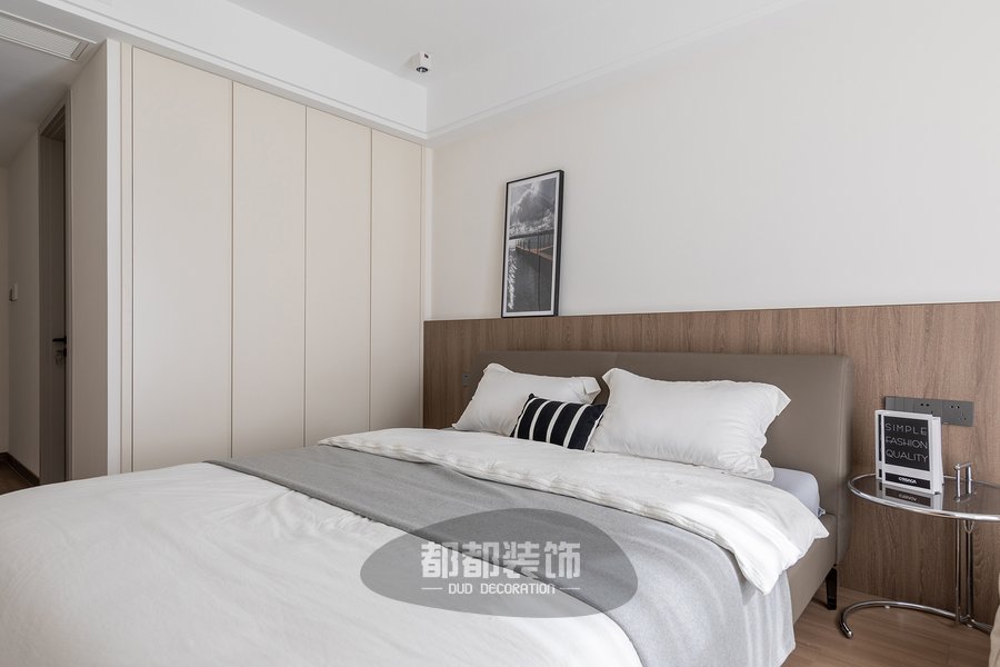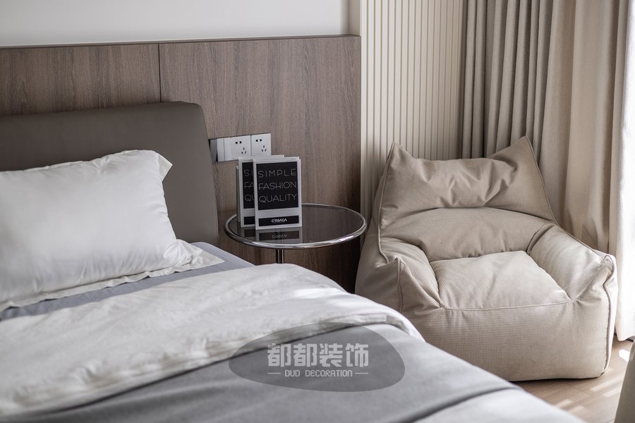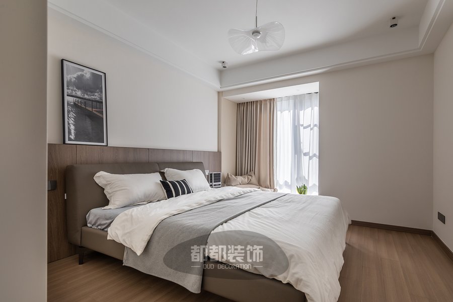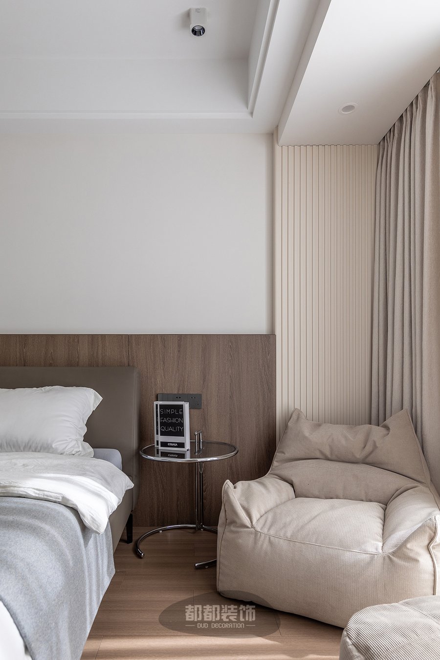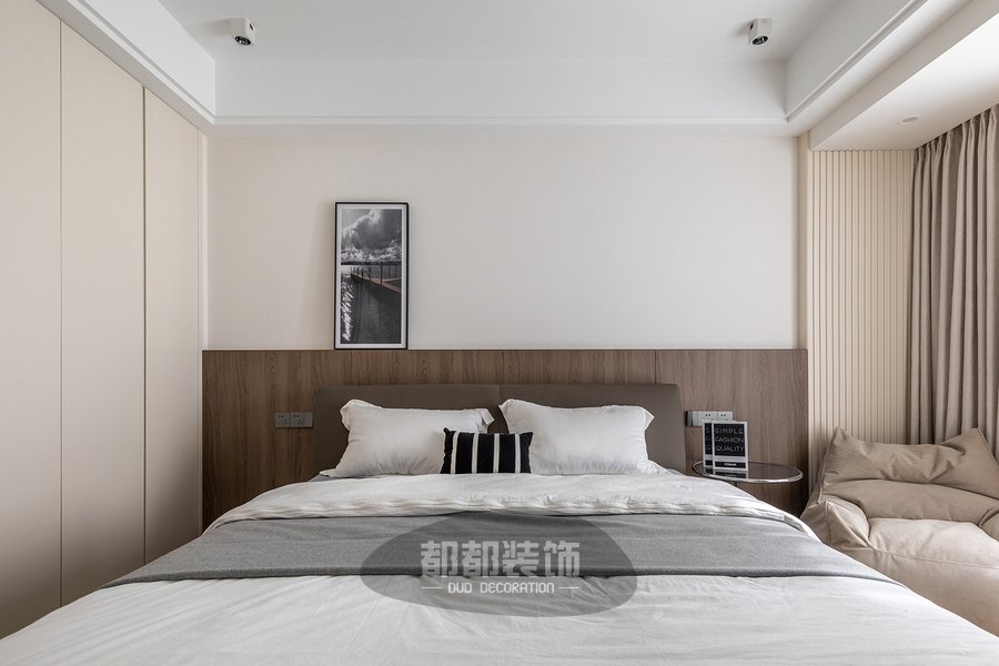 主卧的布置延续清爽简约风格,低饱和米+棕的色调愈发凸显空间质感,背景墙上局部的原木材质,以简驭繁,营造出原木MUJI的舒适惬意感。
