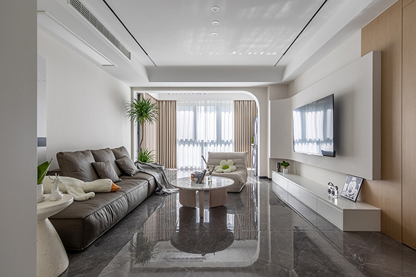 客厅整体是奶油色与原木的搭配,清爽的同时又不乏温馨,日光经由阳台窗户,尽情洒入室内,打造出明亮轩敞的家庭核心区域。