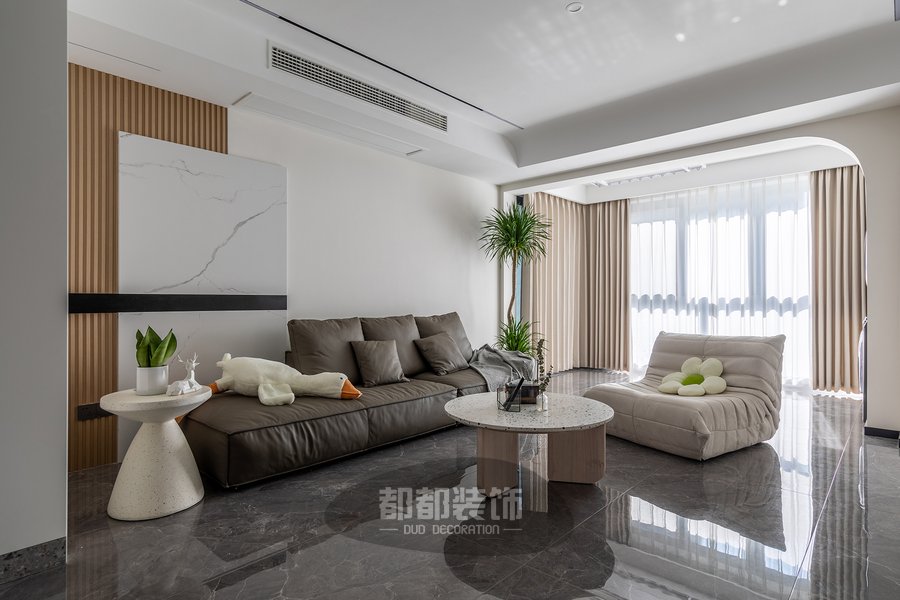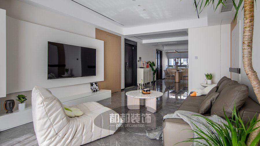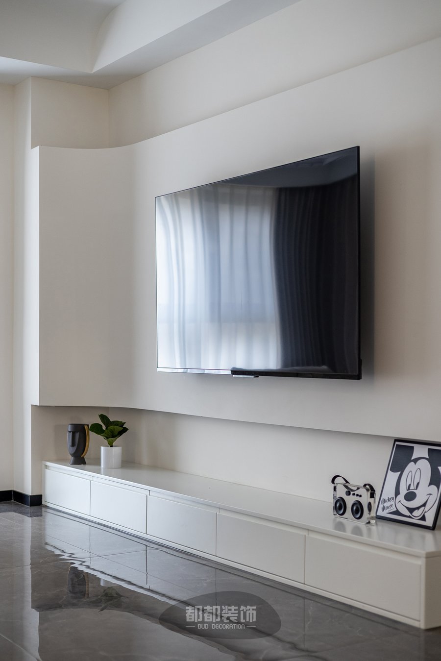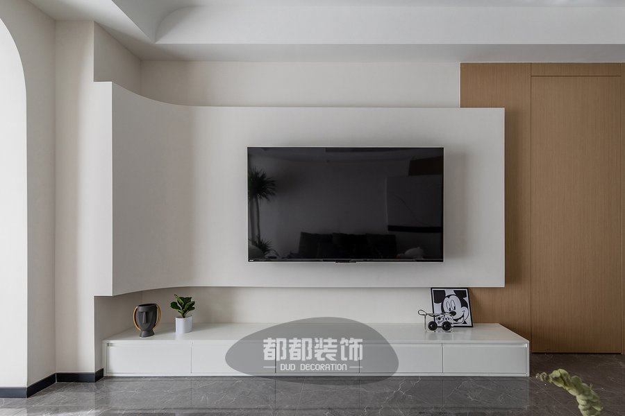 电视背景墙通过木饰面和石膏板材质的叠加,制造丰富的视觉层次,下方一组奶白色地台柜,与墙面的弧形搭配,一方一圆让空间更有趣味,局部采用原木和绿植点缀,空间更添清雅写意气质。