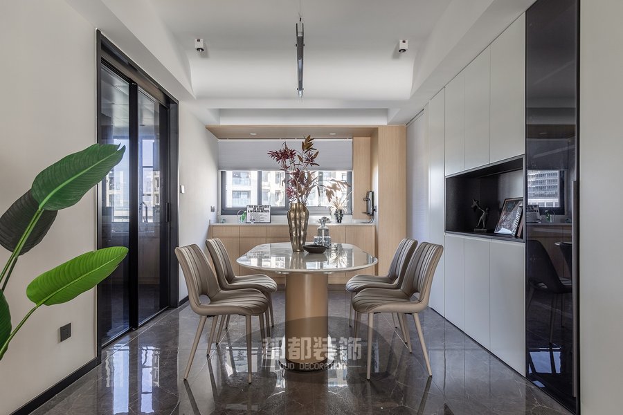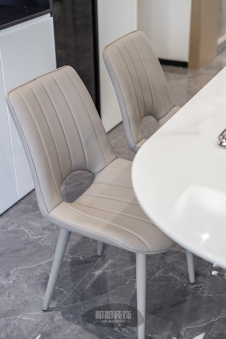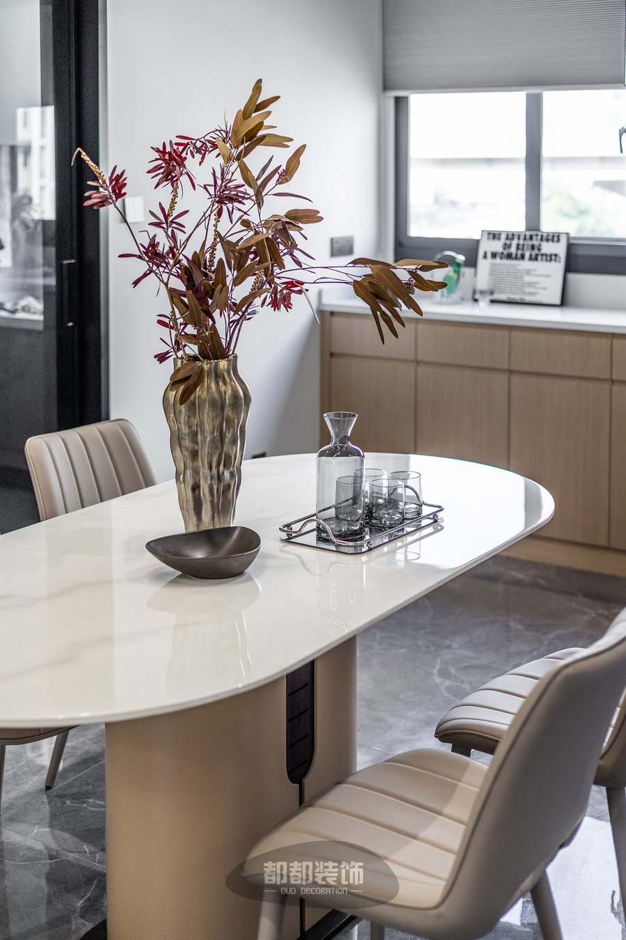 餐厅置于靠窗处,阳光、微风、美食,构建出理想的用餐场所,大理石餐桌摒弃繁复,简洁明快,让身处其中的人得到身与心的深度放松,椭圆形餐桌更符合中国人生活习惯体现家的温馨感。