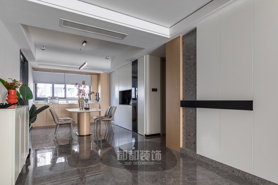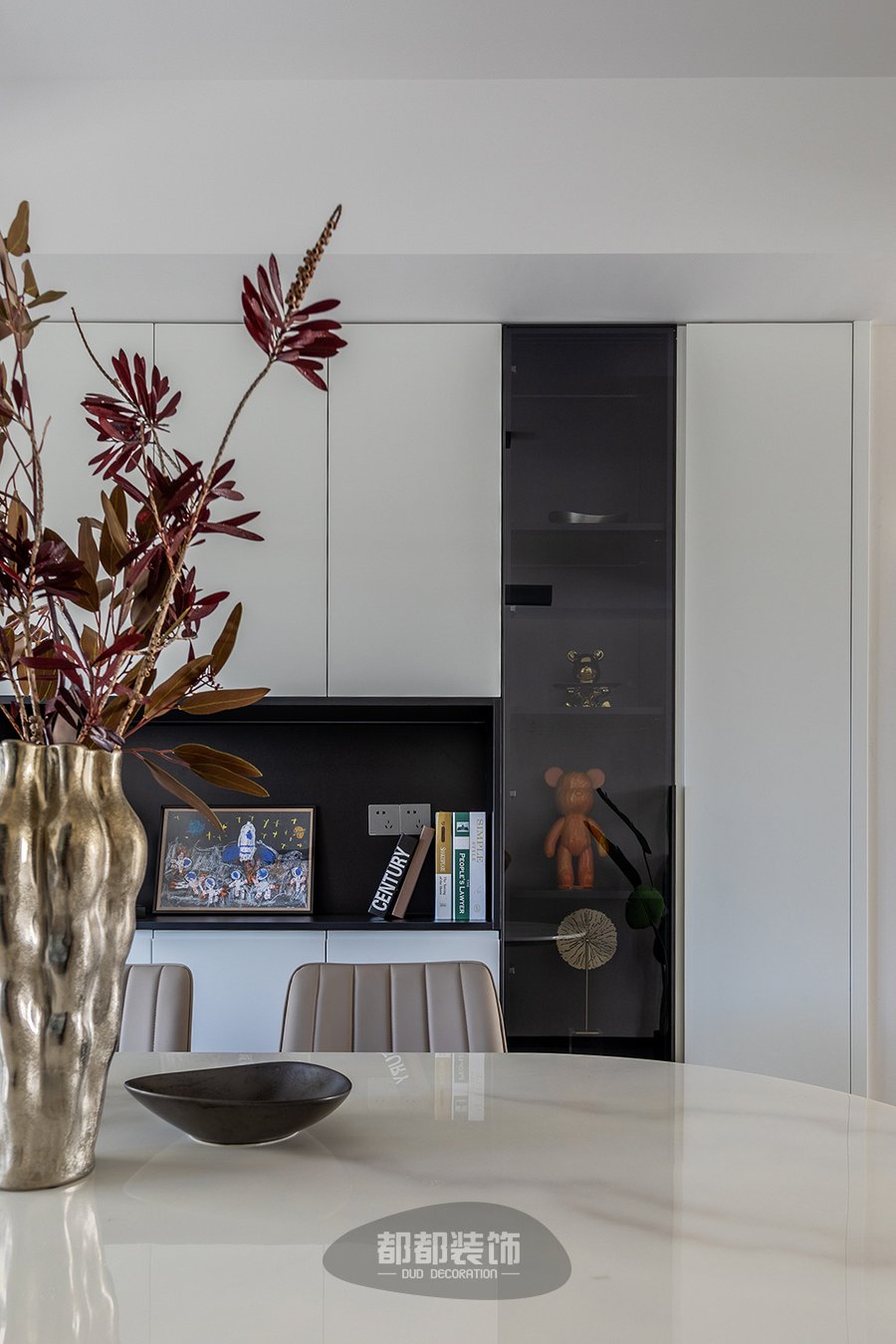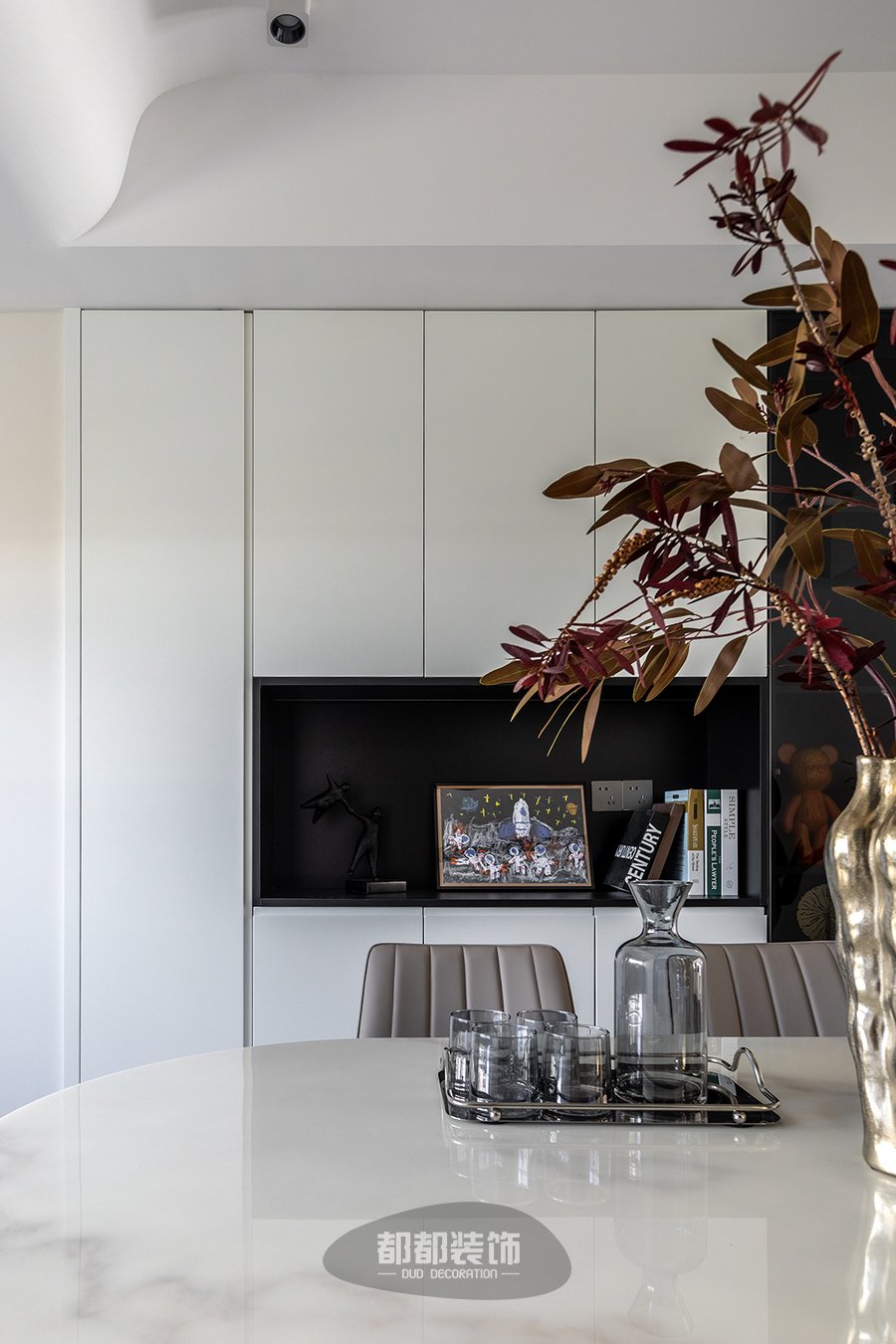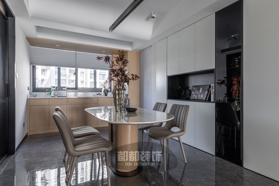 餐厅置于靠窗处,阳光、微风、美食,构建出理想的用餐场所,大理石餐桌摒弃繁复,简洁明快,让身处其中的人得到身与心的深度放松,椭圆形餐桌更符合中国人生活习惯体现家的温馨感。