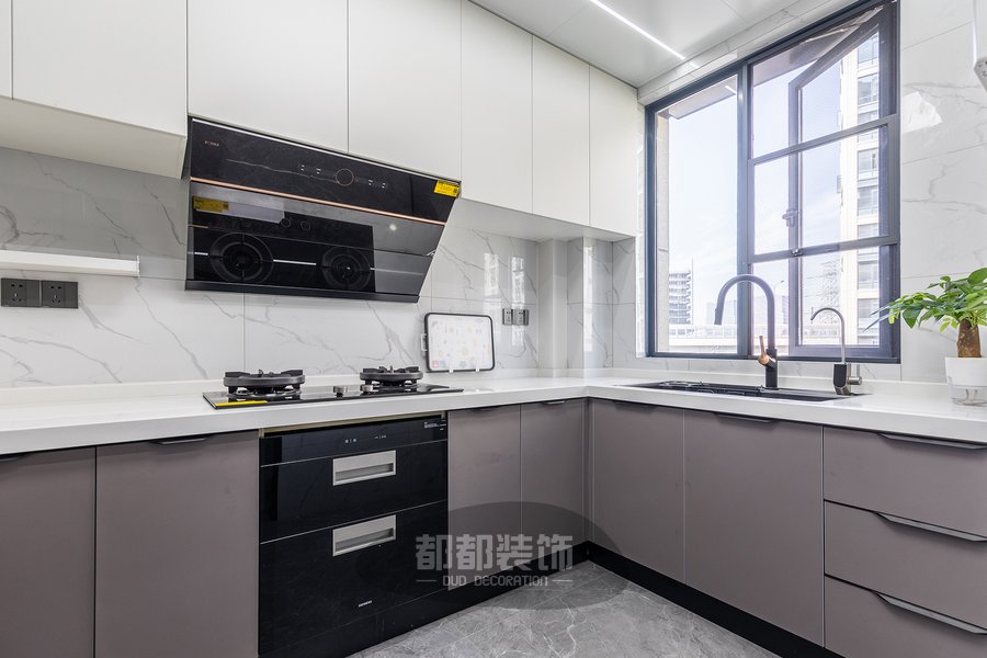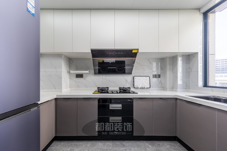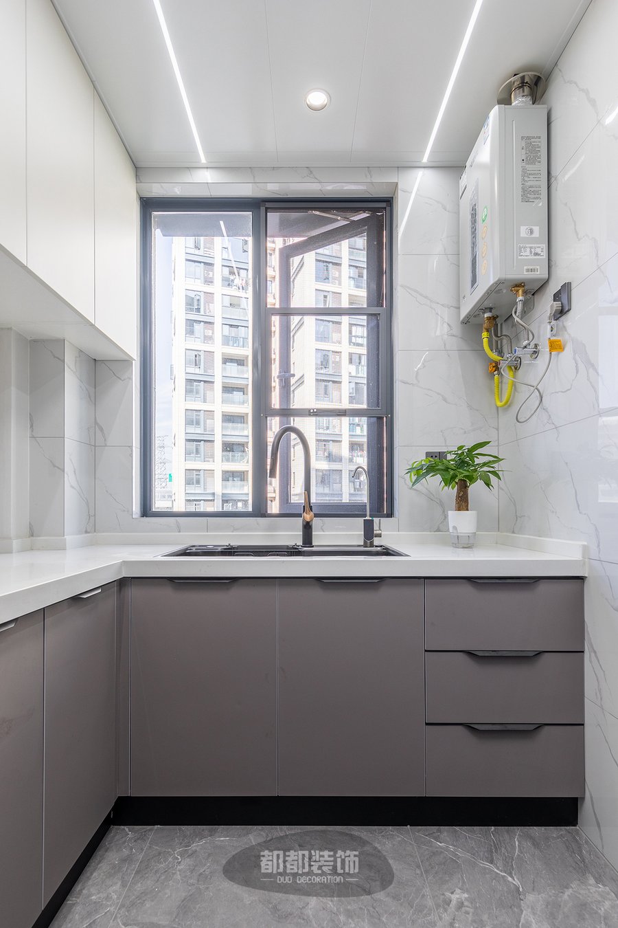 厨房通过与客餐厅建立联系,烹饪用餐更加方便,墙面通铺的白色纹理大砖,不惧油污水渍,方便打理清洁,落地柜+吊柜的组合,充分释放厨房收纳能力,减少日常整理负担,吊柜无把手的设计更利于卫生的打扫,左侧嵌入式冰箱让下厨空间更显大!