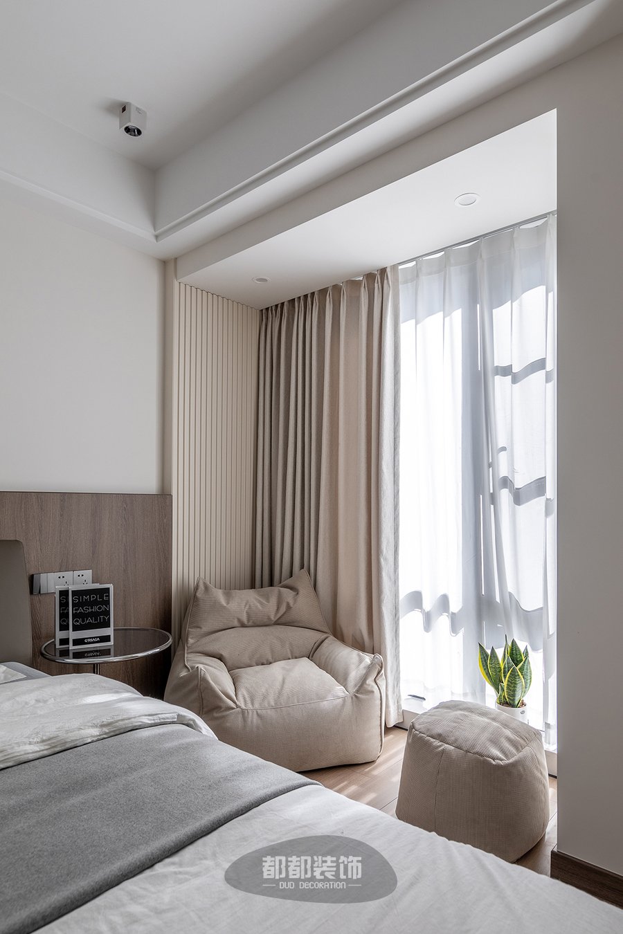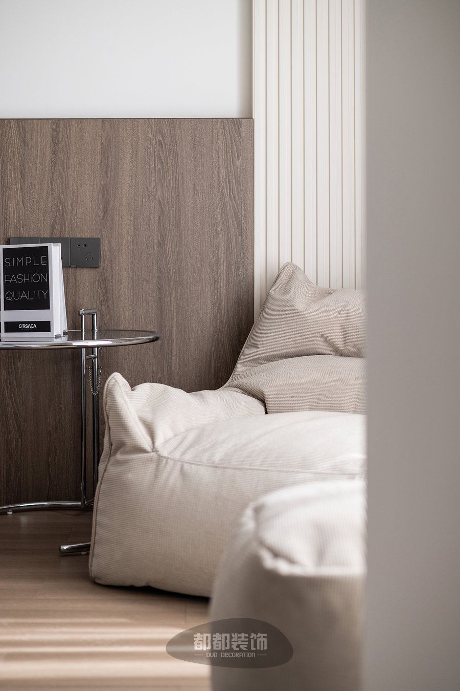 主卧巧妙利用半墙阳台的空间,根据凸出区域宽度,放置了厚实的懒人沙发,背景墙加入竖条纹格栅进行拼接,勾勒出立体的艺术美感,共同围合出一方静谧休息之地,自然光与奶油色交织,空间更加明朗、温柔。