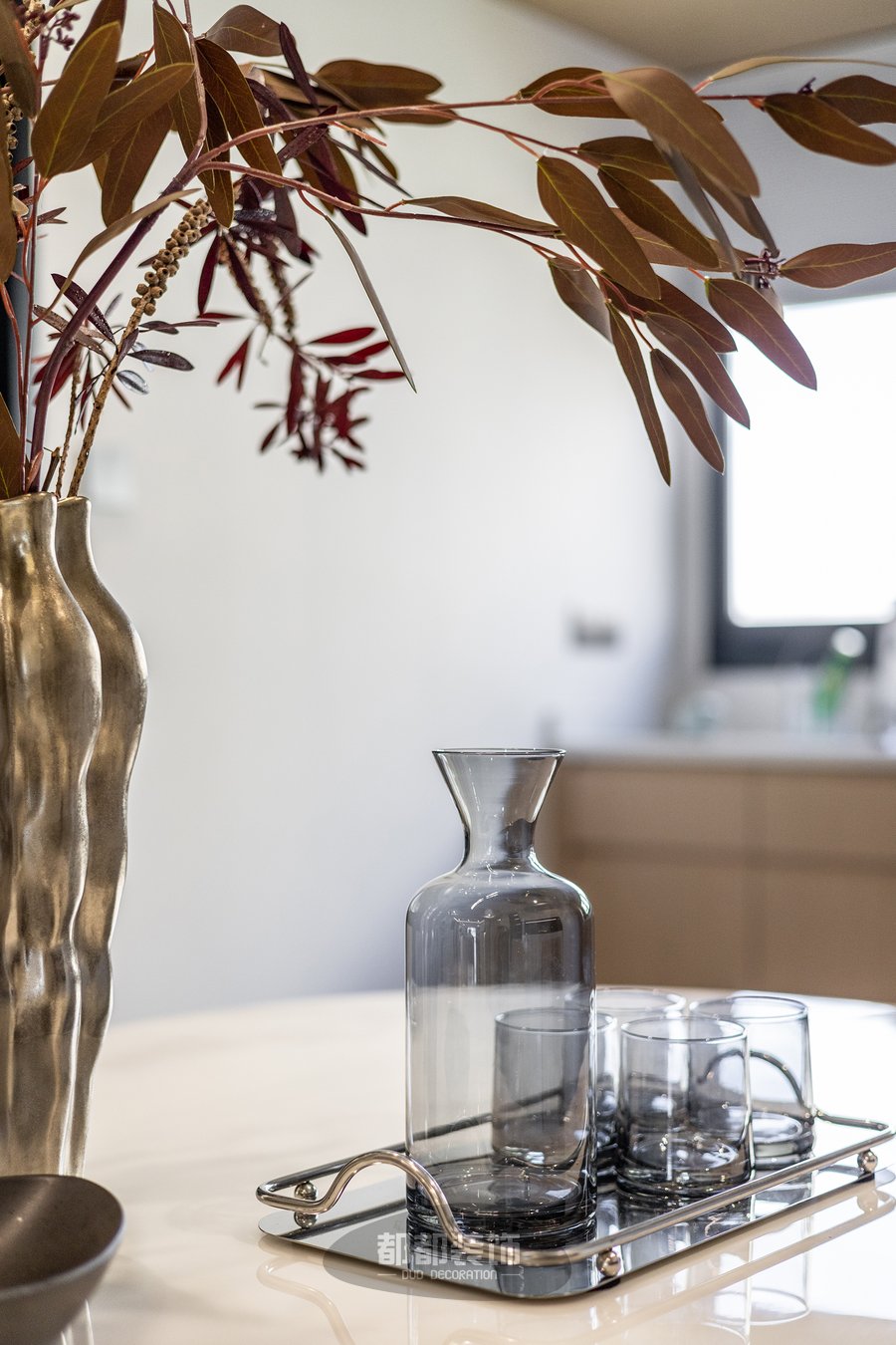餐厅上方的线性吊灯与餐桌长度相匹配,奶白色椭圆形桌面配合浅卡其色餐椅,柔和弧线演绎出法式浪漫;复古红盆栽颇具秋日氛围,在艺术情境与生活场景之间寻求美与实用性的统一。
