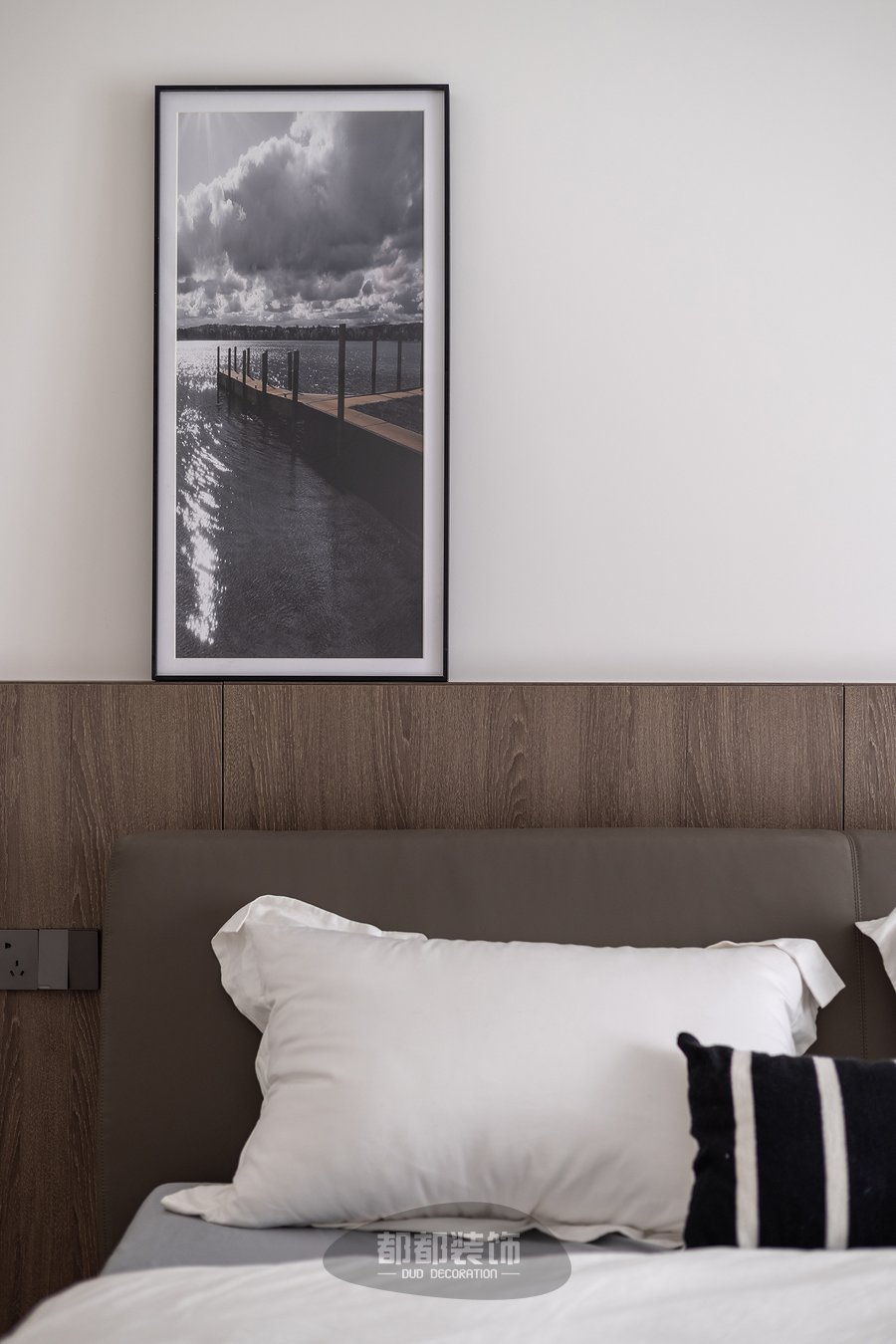 床头简雅的白调与温润的木饰面相互映衬,搭配着风景装饰画,一同构筑出舒适放松的睡眠环境。
