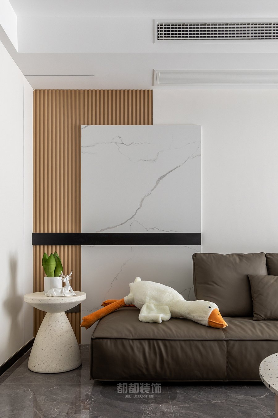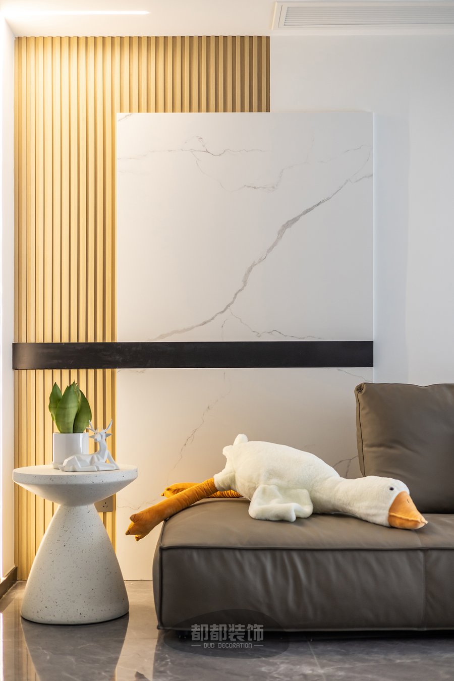 沙发靠墙处设计师也进行了一番设计和装饰,大白墙拼接暖黄色木格栅,衔接处覆盖以鱼肚白大理石岩板,三种不同材质组成了让人眼前一亮的视觉效果。