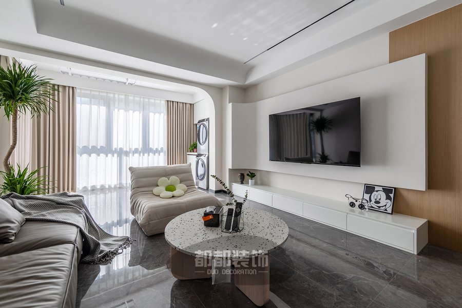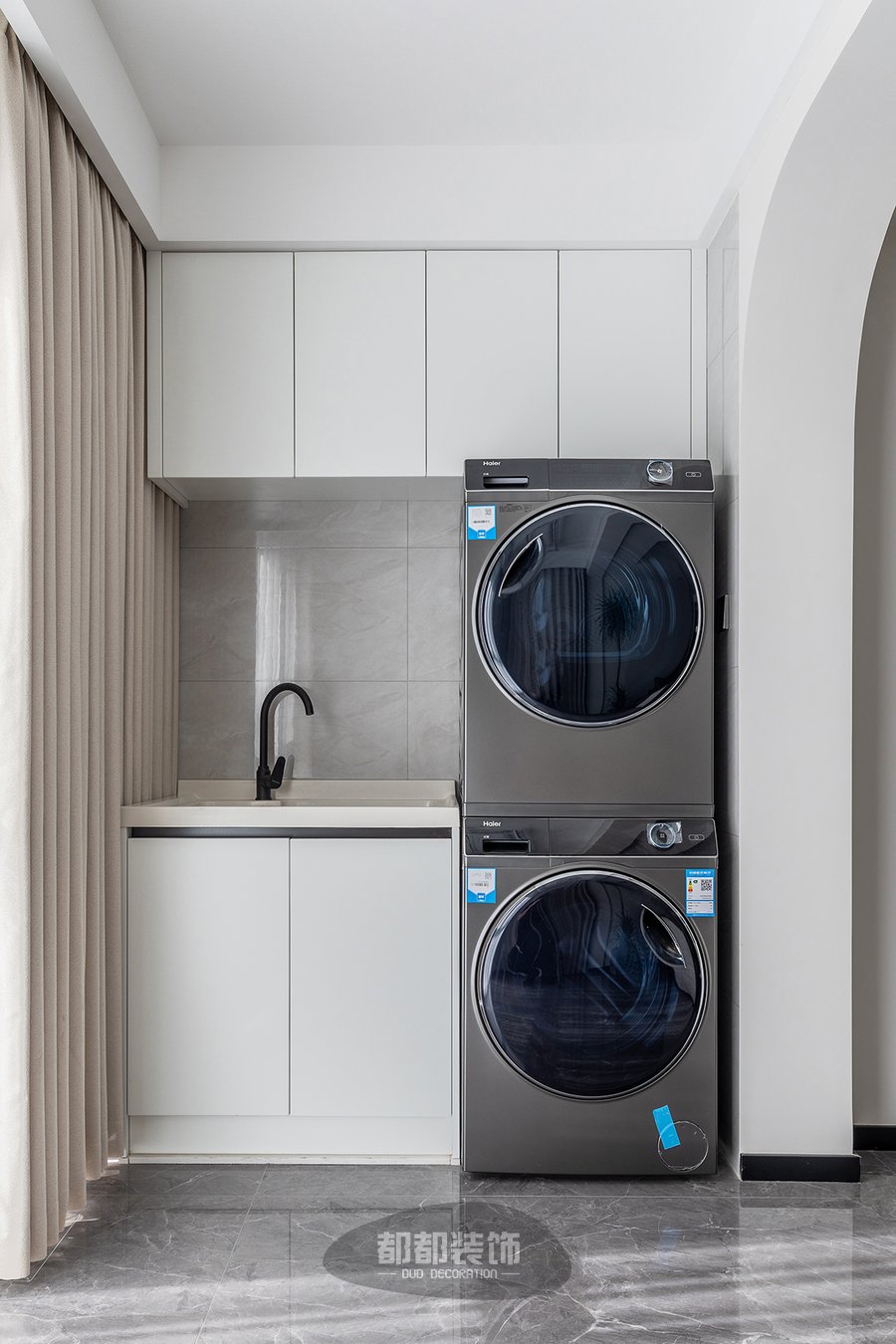 将客厅和阳台用弧形拱门分割,使得整体空间变得“无限大”,洗衣机和烘干机专门买的相同尺寸,这样叠放使用的时候安全系数提高不少,灰白色系优雅又高级。