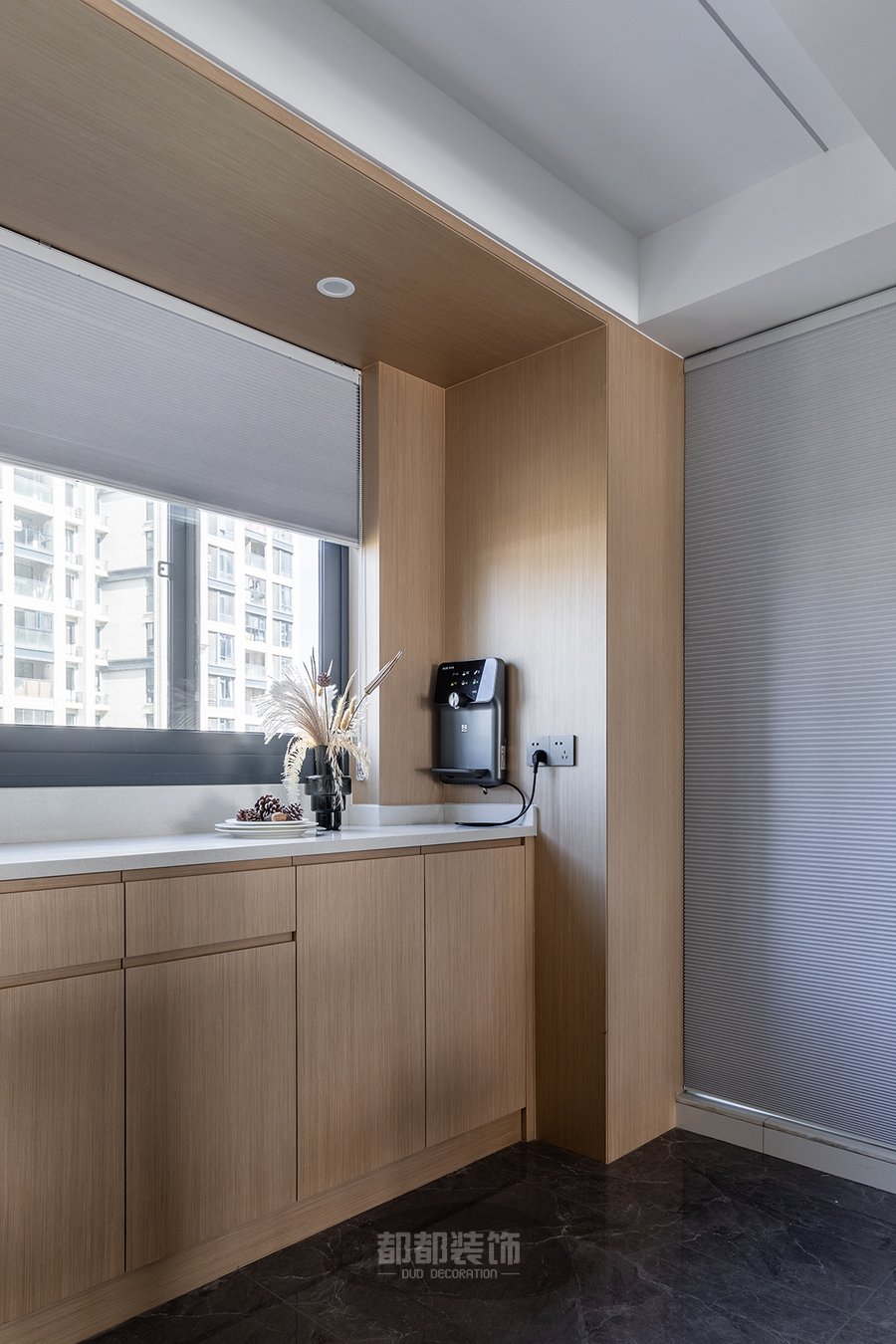 利用墙面空间靠窗布置收纳柜,将书籍、摆件收入其中,用餐后随时可以读读书、看看报,生活井井有条,餐桌旁还定制了一套原木餐边柜,在这里向远处望去采光极佳,还减弱了空间本身的局促感。