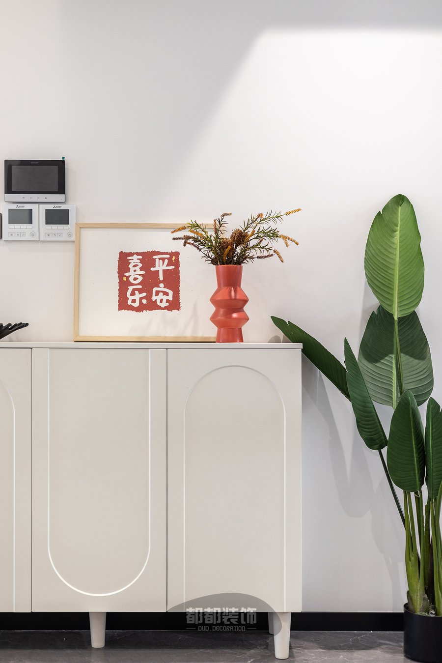 步入冯女士的家,看着这套乳白色的玄关柜,立刻就能感受到一种清新淡雅的气息扑面而来;“喜乐平安”装饰画配上红色瓶盆栽,旁边的天堂鸟绿植点缀空间缓解单调,灵动感十足。