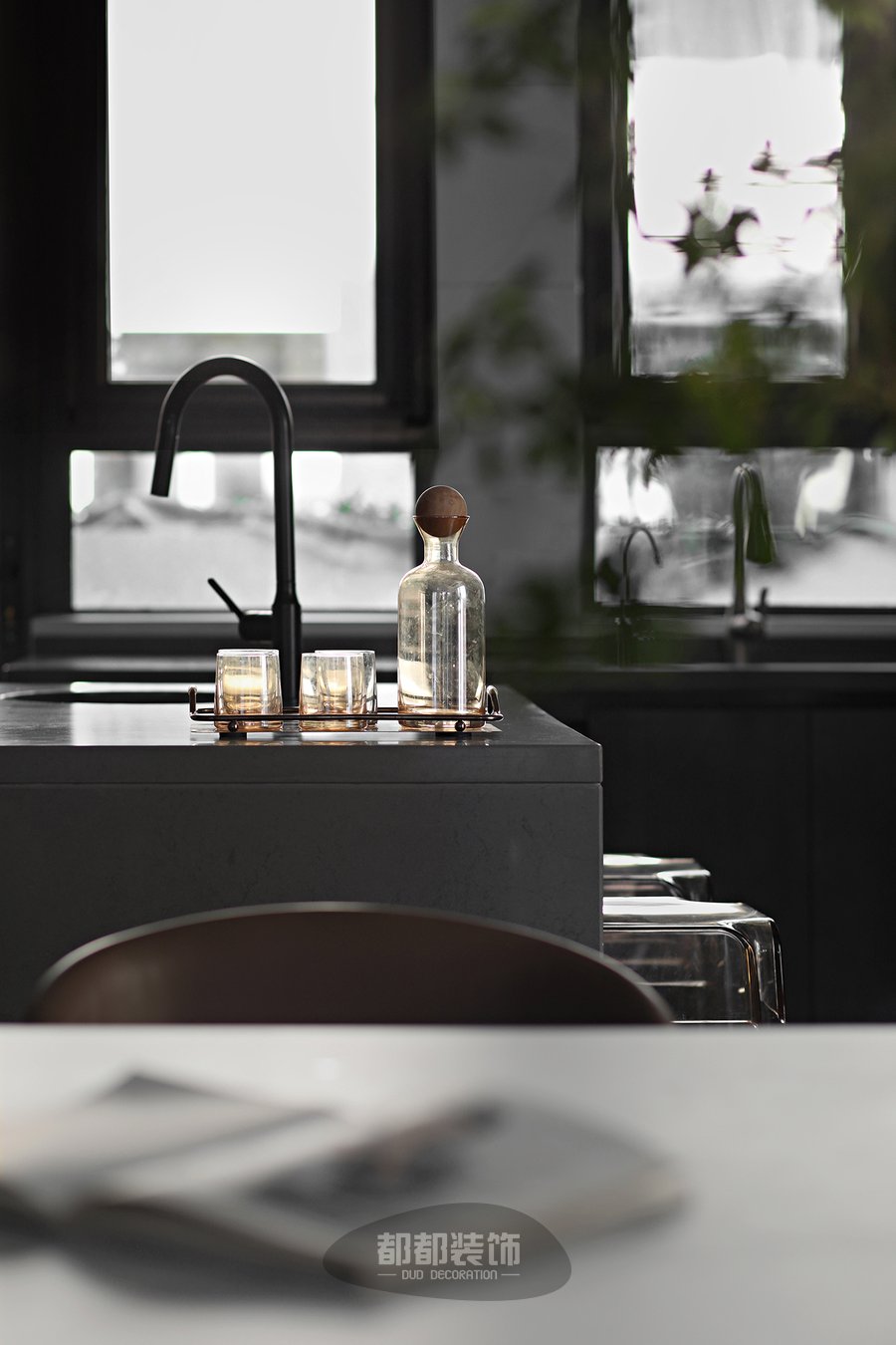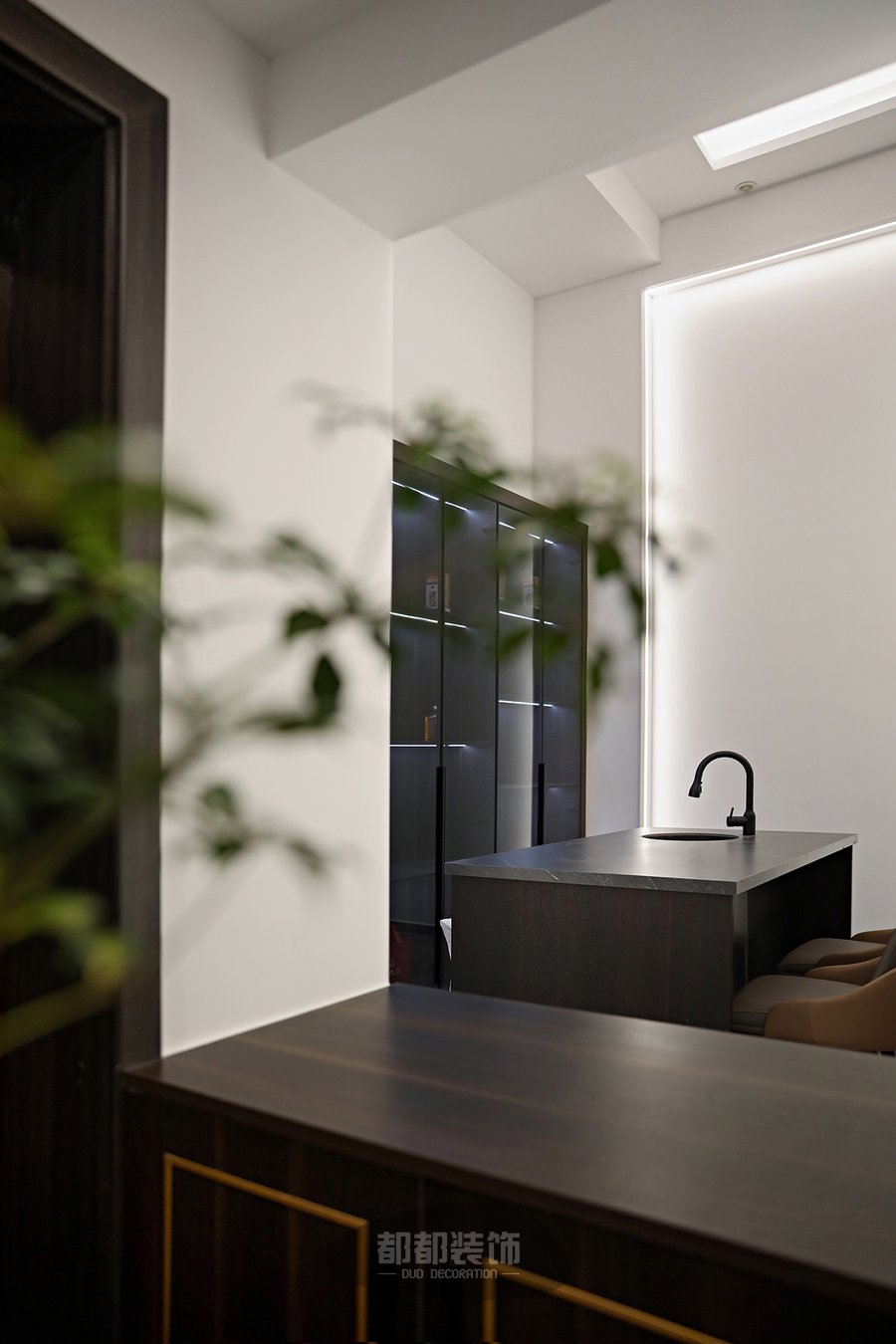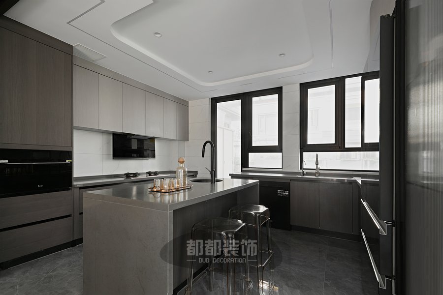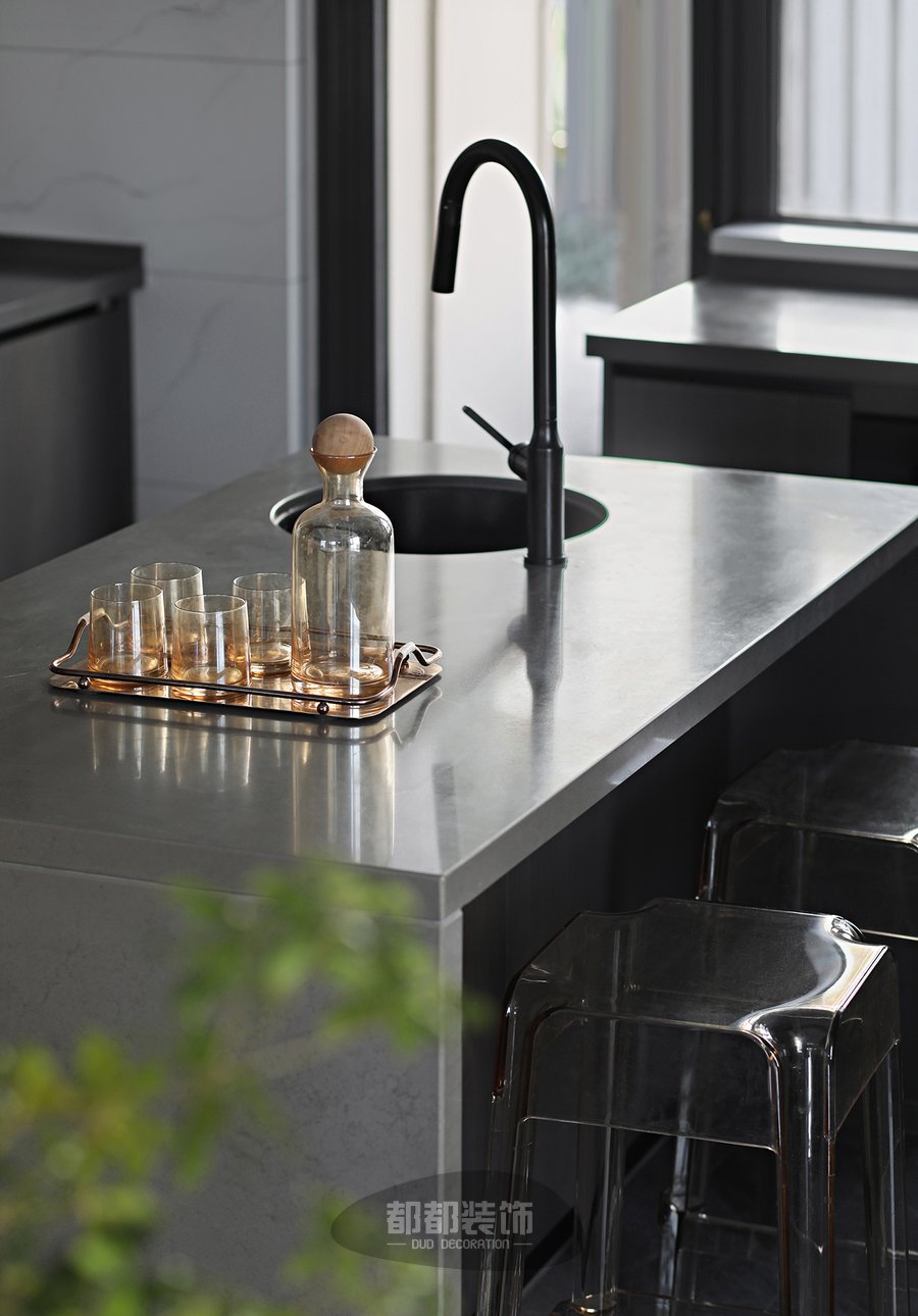 厨房采用大理石墙面加以灰色台面,亚光棕的木饰面在视觉上延伸着空间,为这一处空间营造一道沉稳而坚定的背景,U型厨房的灰色柜体纵向延伸,在厨房中心区域还配置了灵活的水吧台,传达出特调咖啡的意式闲趣,处处充满着浪漫。