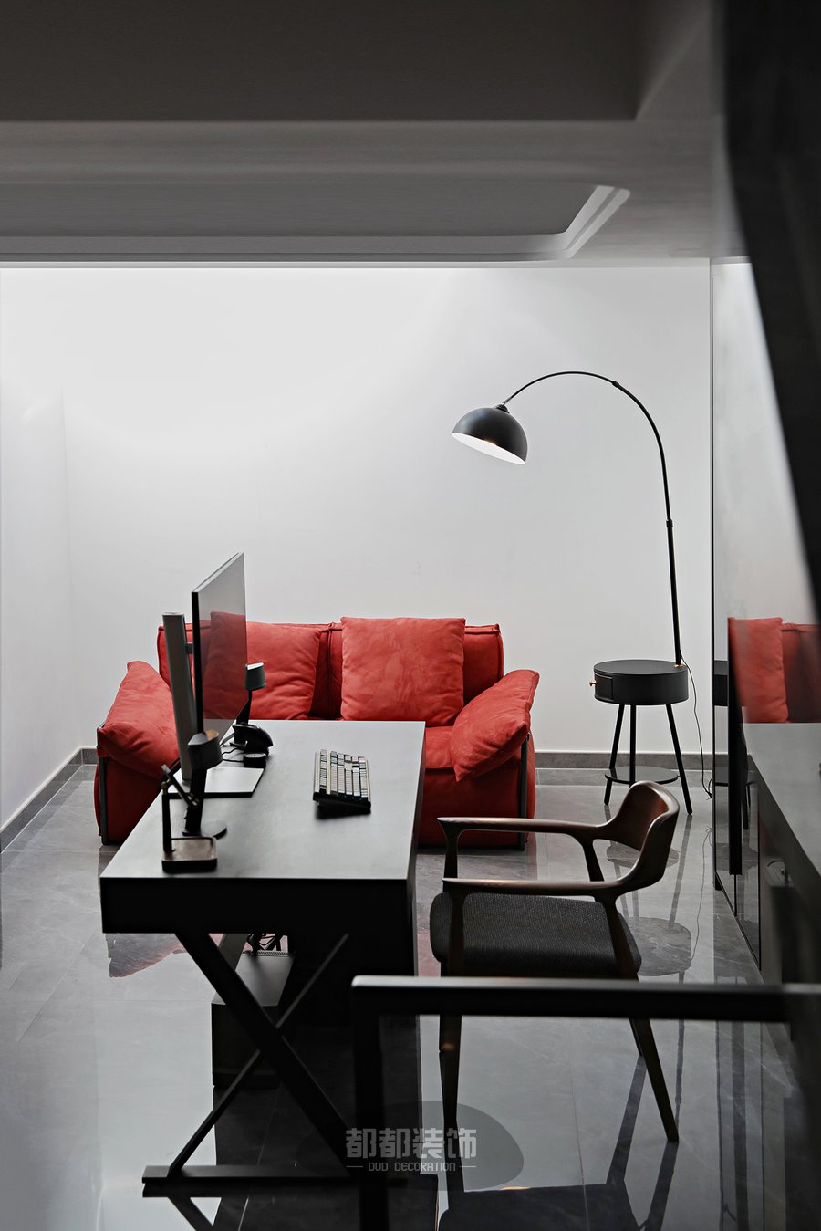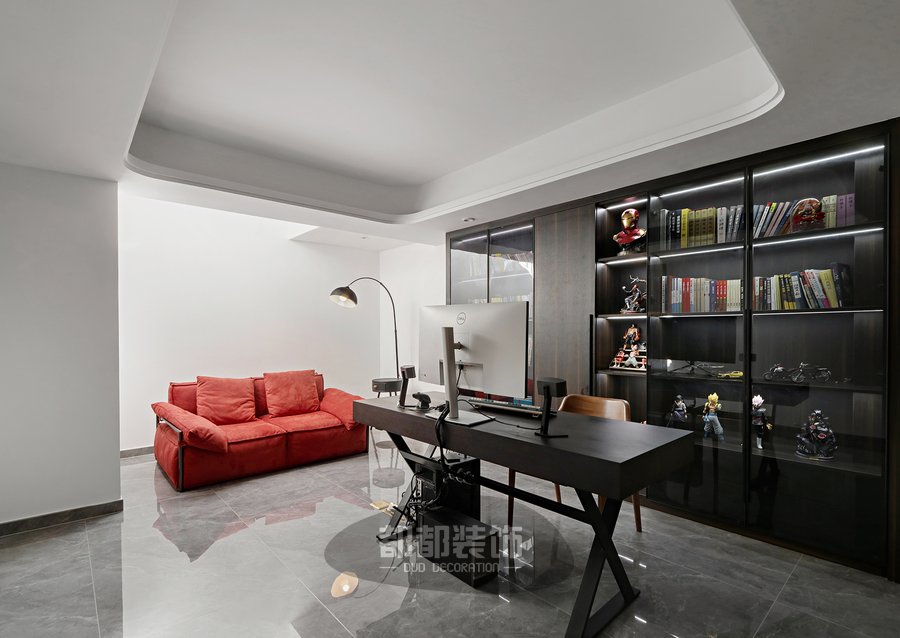 顺着楼梯往二楼走,即能看到全开放式的书房,书房旁边还选用了一套质感柔和的亮红色沙发,一旁侧摆放着自带收纳柜的钓鱼灯,结合散落的温馨灯光,给人休闲惬意的感受,整套黑色办公桌椅搭配书柜,所属怀旧风但又带点摩登的韵味。