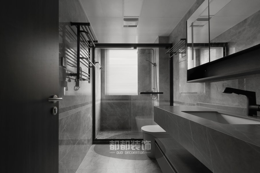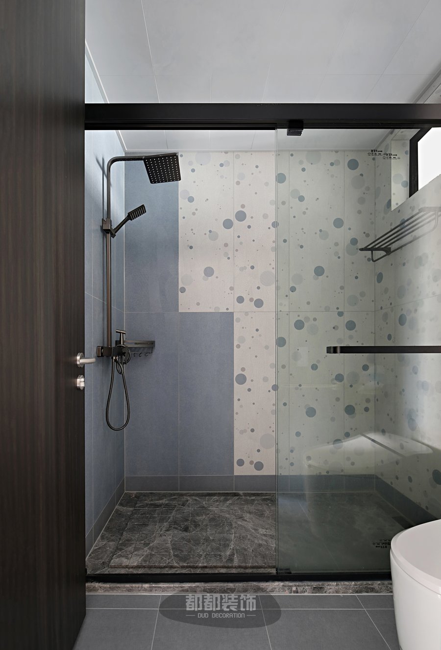 卫浴地面灰色大理石的层次感恰到好处,不规则拼接的蓝色网格砖,搭配蓝白色波点瓷砖,浅蓝色如同海风拂过,一切清新自然,让人惬意放松,深浅大小的圆点更像是海浪与浪花的结合,简约而不乏质感,轻松恬淡的品质生活由此展开!