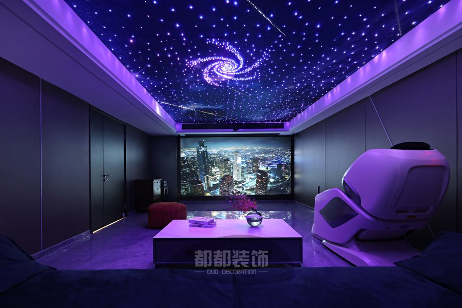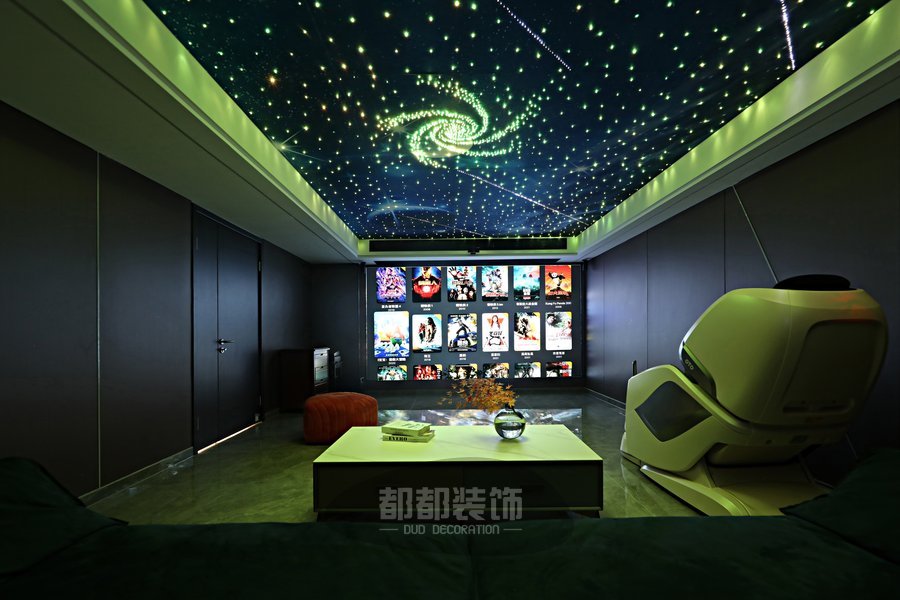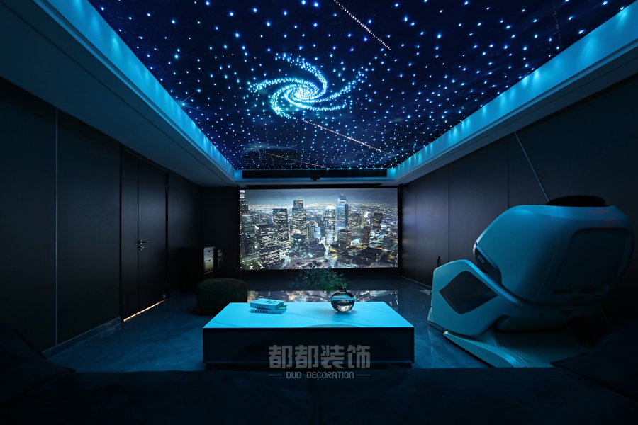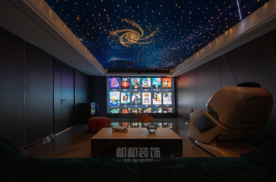 影音室开阔的独立间保证了音场的宽域,120寸大屏的放映幕布保证了视觉的广度,优质的声道让家庭影院系统保证了听觉的冲击力,无论是看电影或是唱歌,空谷幽兰之音或是气势磅礴的号角,都能被诠释的淋漓尽致!各色变换的漫天繁星空顶让观影效果超赞!