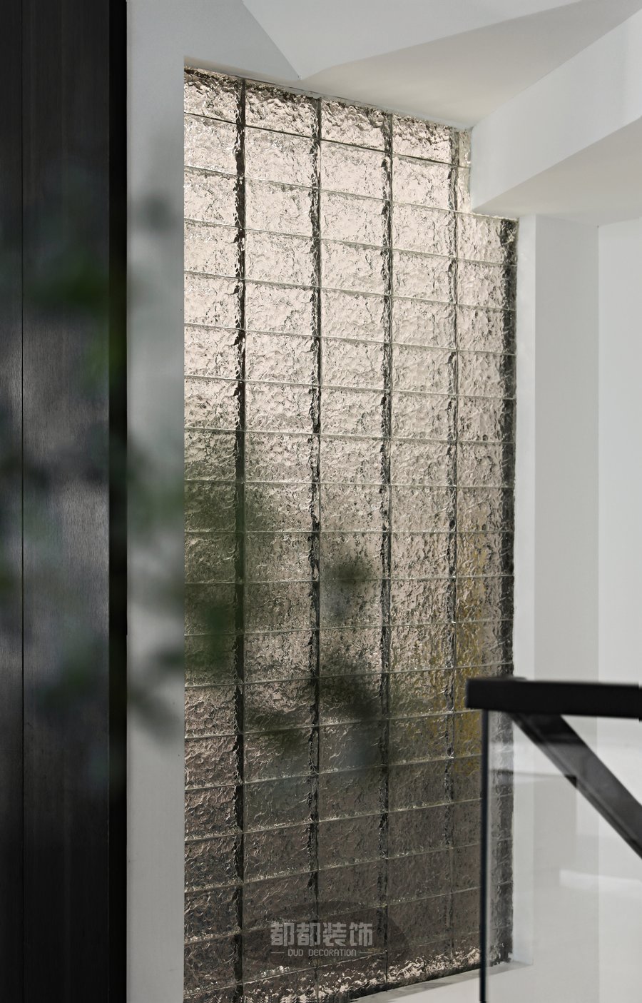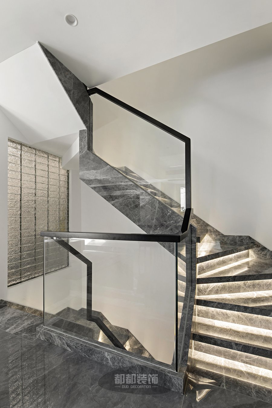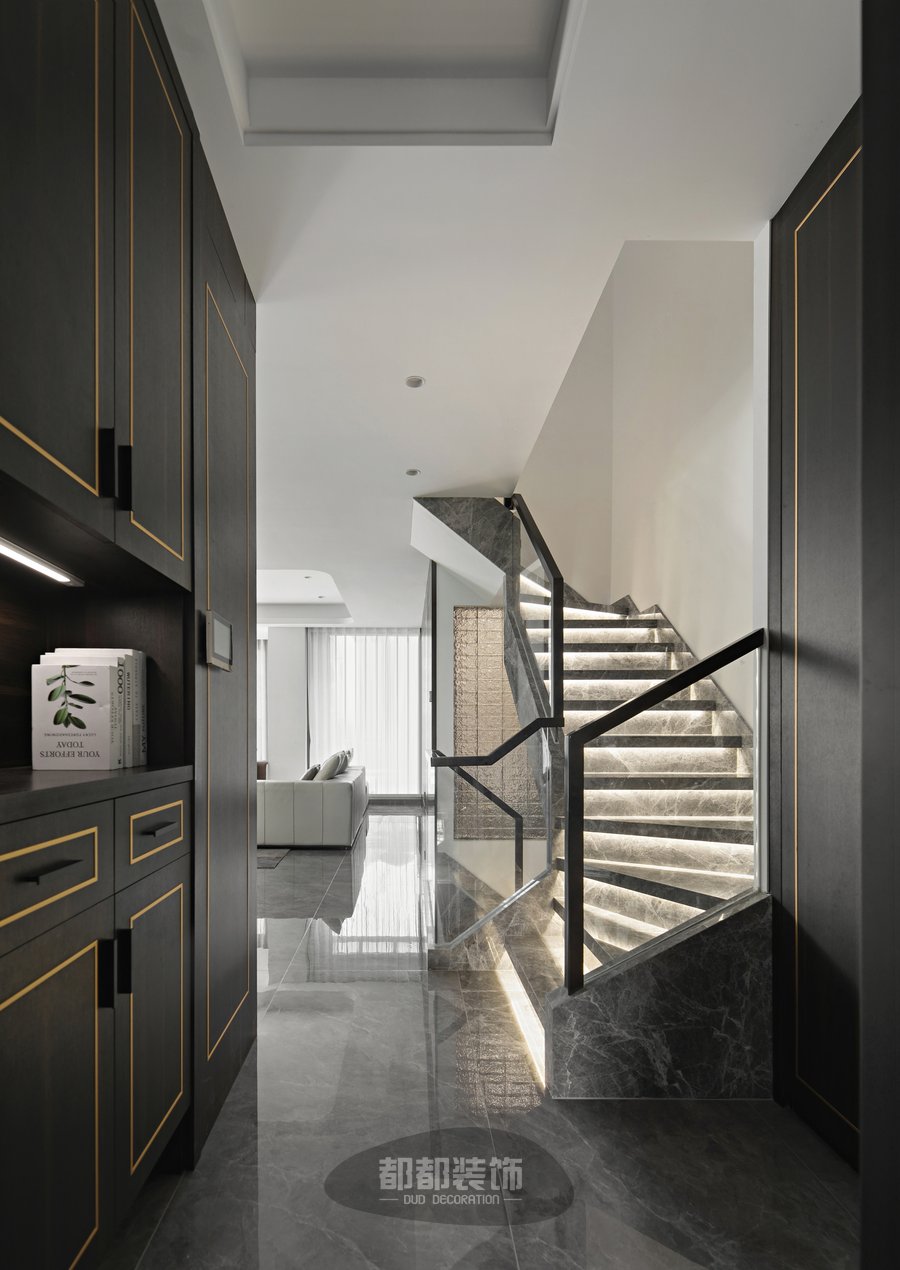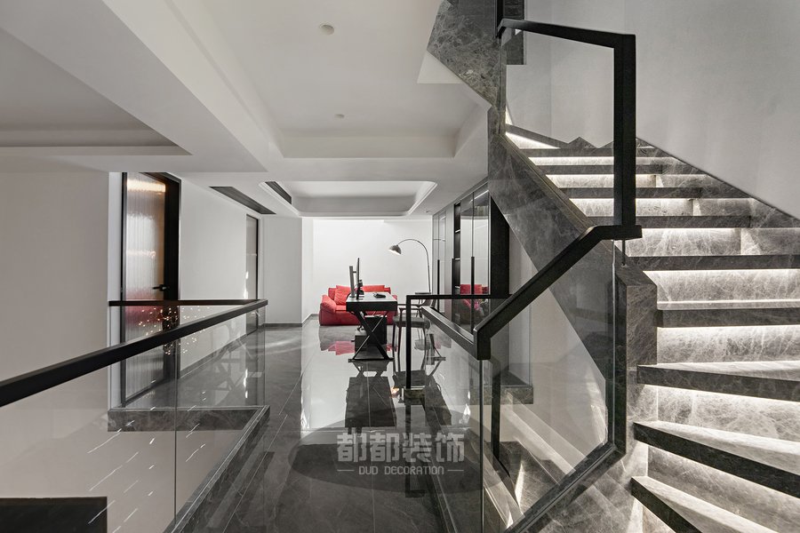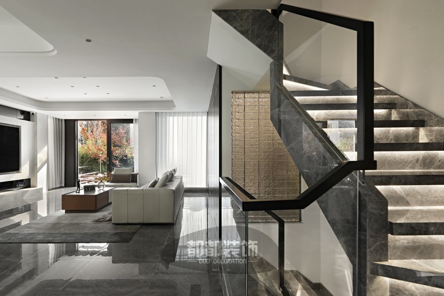 楼梯设计是整屋不可或缺的一部分,灰色大理石岩板+温馨灯带让寂静的空间弥漫着浪漫的气息,水波纹的玻璃砖墙模糊了两个空间的界限,也将光线引入内部空间。