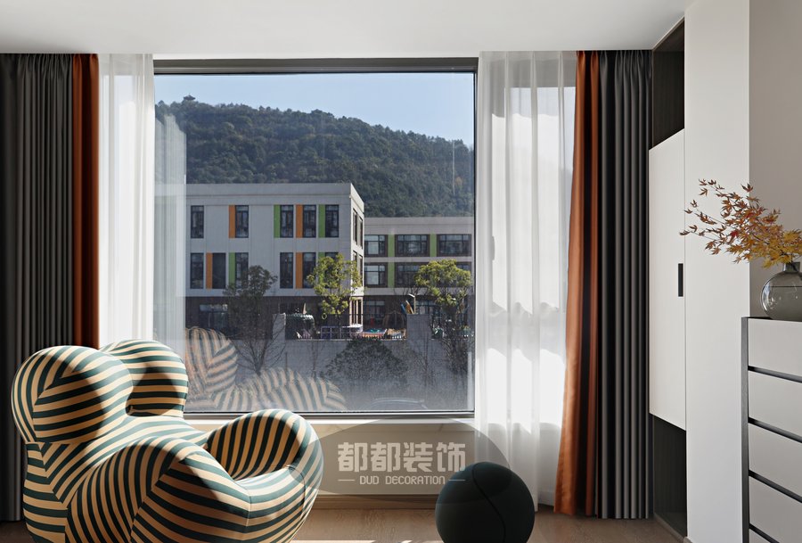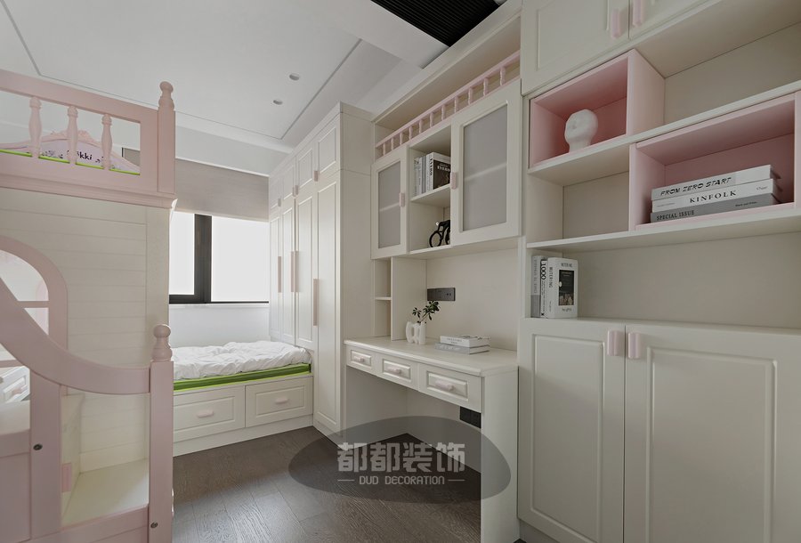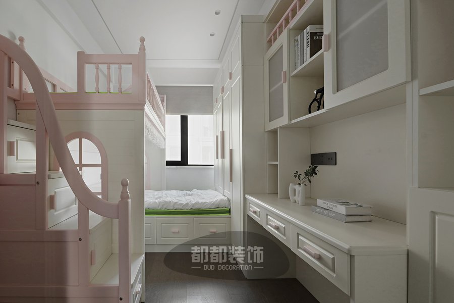 儿童房主要采用错位上下床结构,下面是榻榻米和衣柜,上面是带安全围栏的单人床设计,榻榻米床底和楼梯台阶都自带置物柜,满足孩子的收纳需求,下床与书桌的结合让空间得到充分利用,由于错层设计,两个孩子都有了独立的休息空间,夜晚睡觉舒适不压抑。