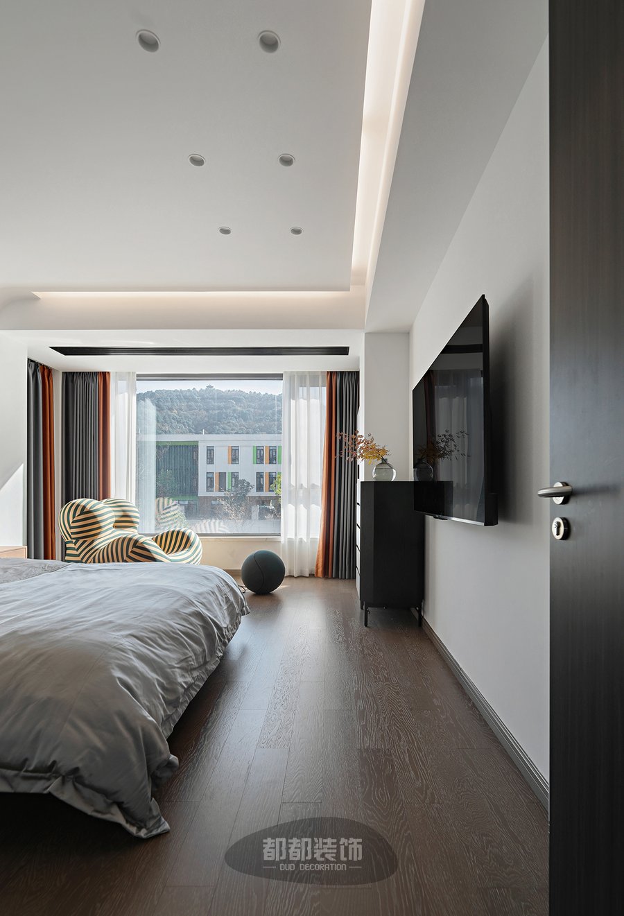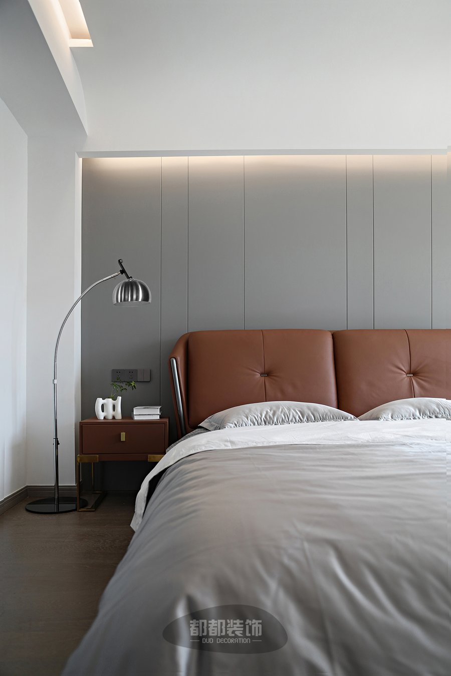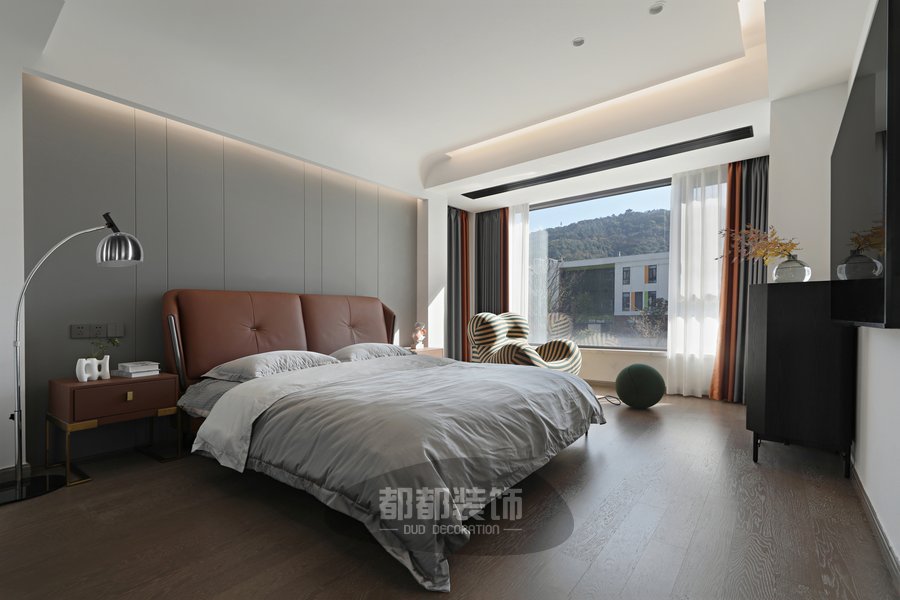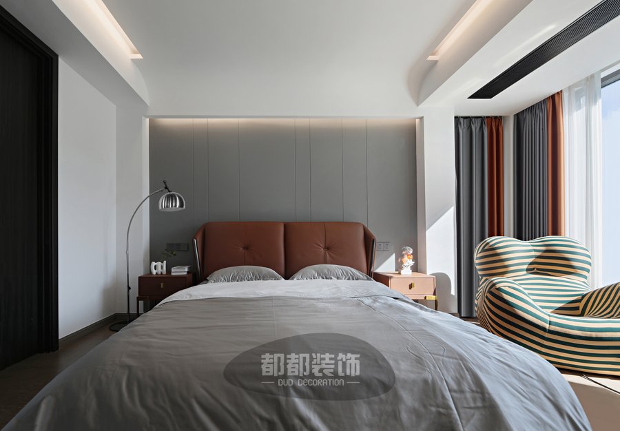 设计师在卧室整体色调的把控上别有用心,醇厚棕色软包靠背,灰色系纯棉床品,工业风落地灯,配以斑马纹懒人沙发,展现出不失怀旧风格的港式居所。