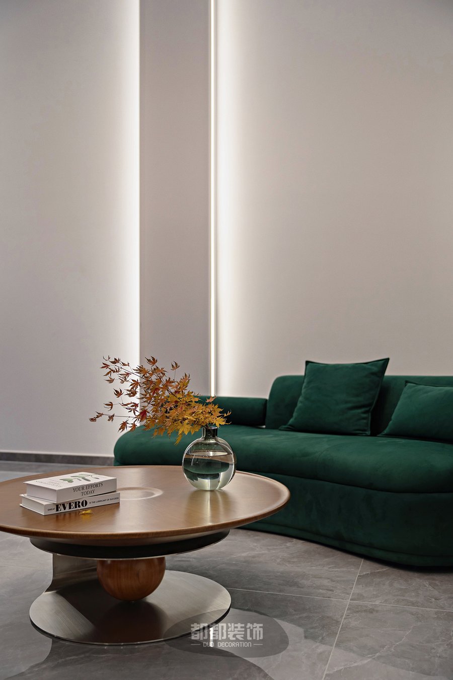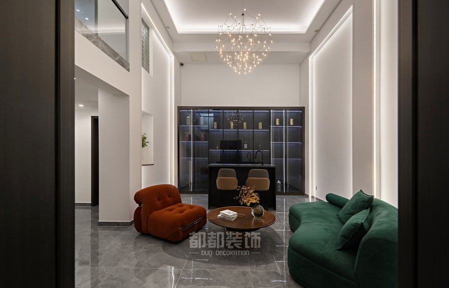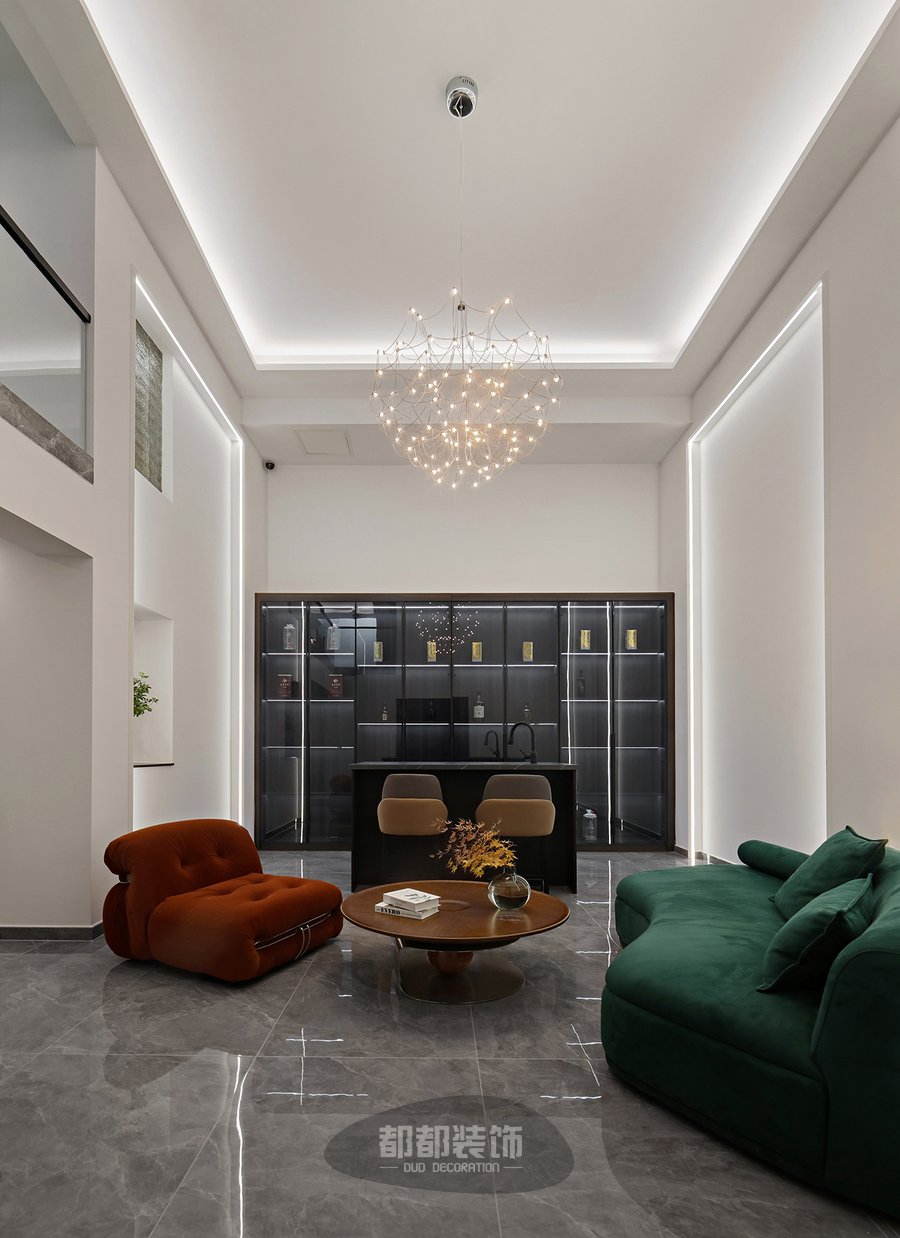 复古红绿配色的丝绒沙发、水晶材质的萤火虫灯、老式复古的茶几,都是香港风情的体现;靠墙酒柜的设计,选用了具有粤式怀旧质感的灰色玻璃和复古做旧的柜体搭配在一起,还原出港式电影中的氛围,最终呈现了一个精致且既有现代气息。