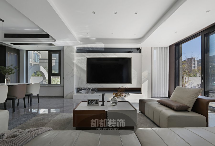 客厅背景以极具质感的纹理大理石为主,简洁、开阔的平顶搭配无主灯设计,充分拉伸视觉层高,正如港式轻奢的个性,以低调和质感独树一帜,在多元文化中形成统一。