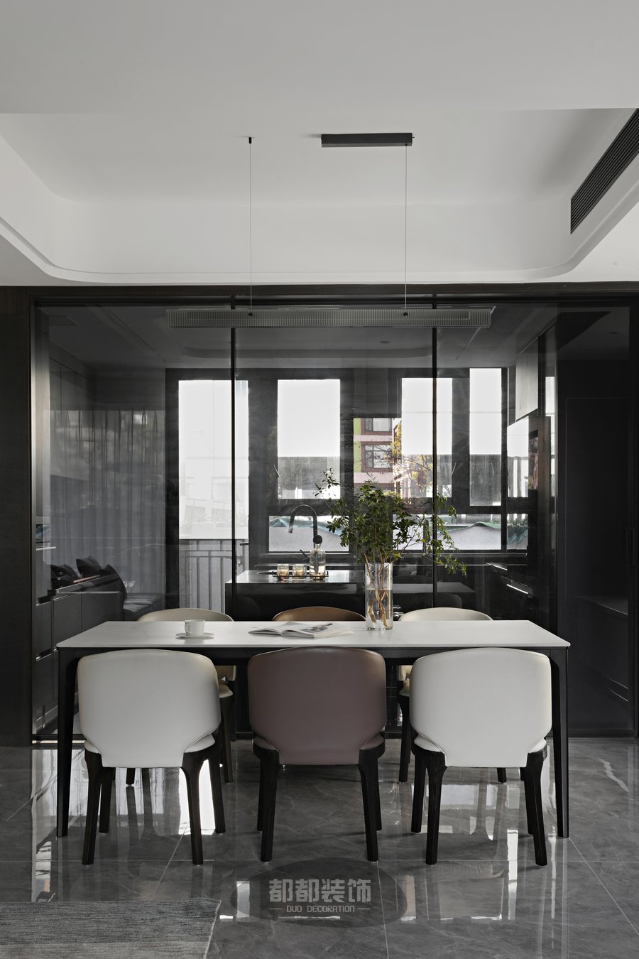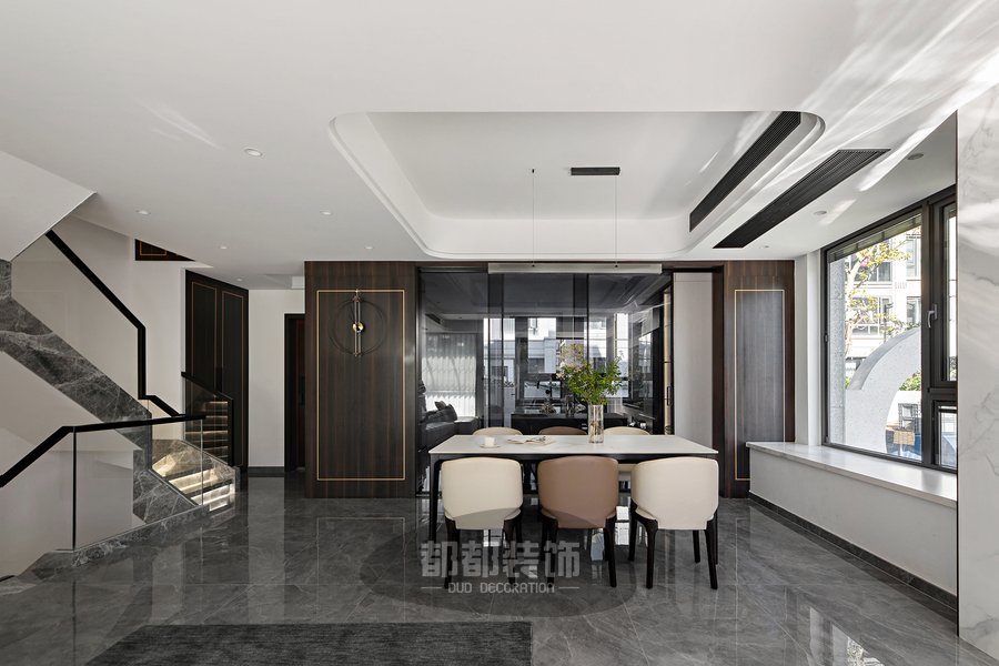 餐厅在温色域里渲染大理石与原木的浓郁与内敛,交织着色彩的双重特性,晕散出大气奢华的居家想象,扦插的水培绿植,白色小清新餐桌,精致的瓷具,意大利小牛皮餐椅,无不传达着独特的港式精致,将温馨的情调融化到整个空间内。