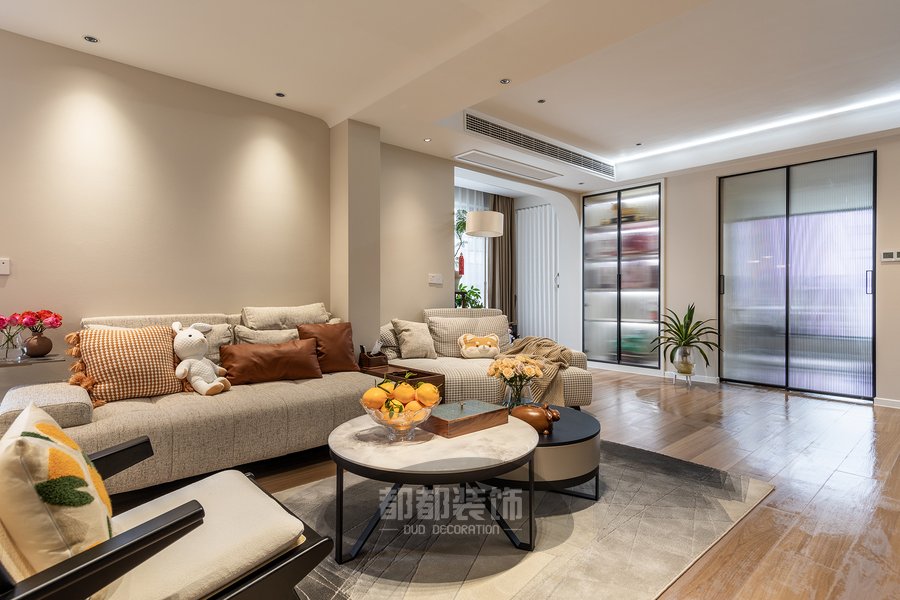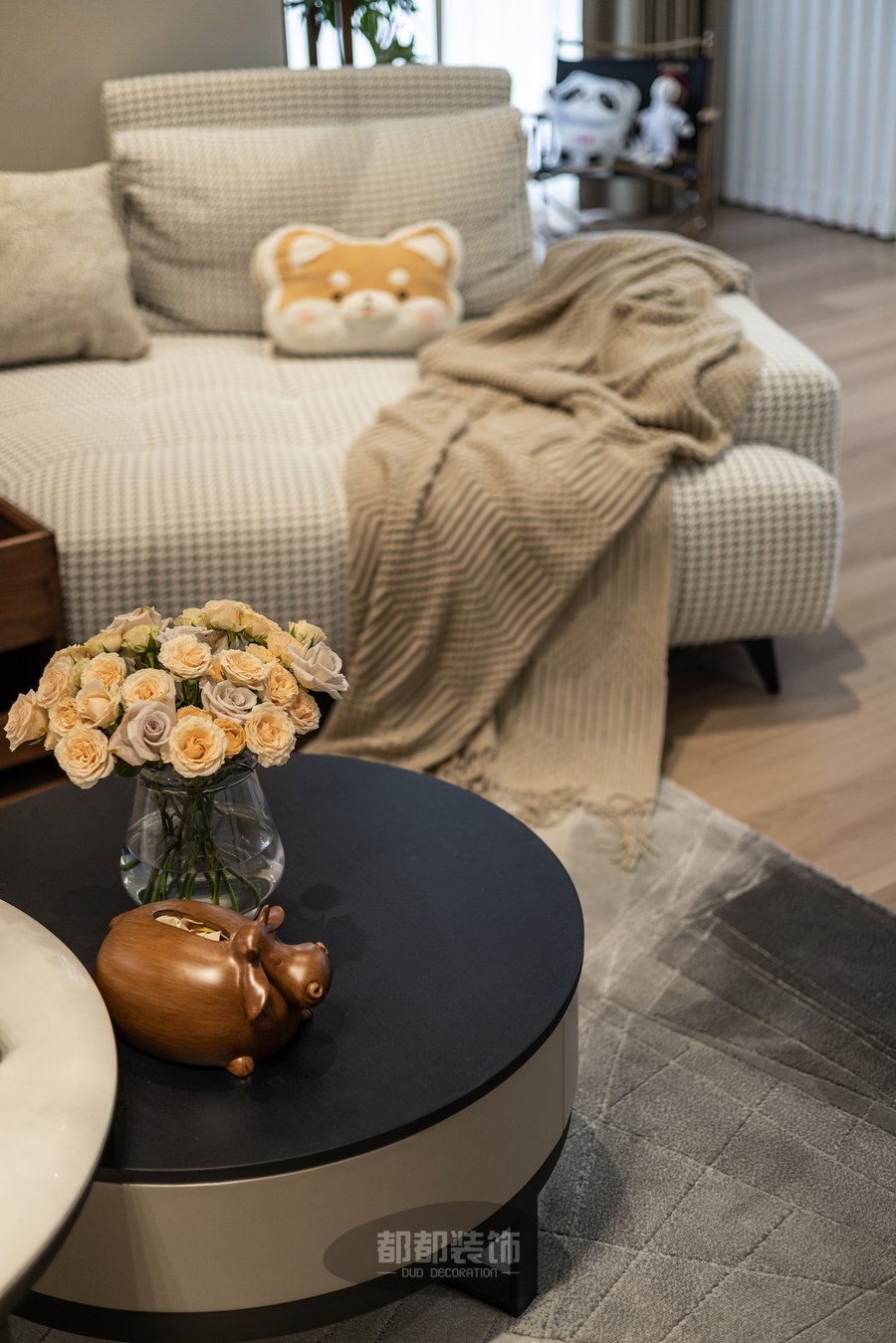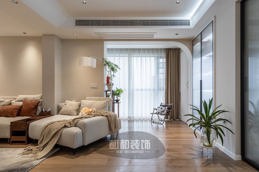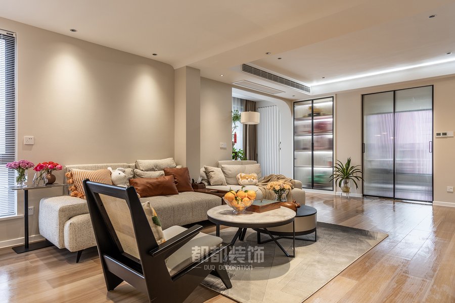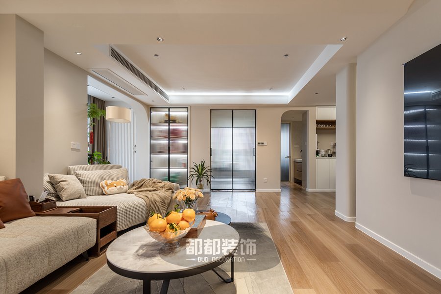 沙发一侧的走廊安装收纳柜,再多凌乱也能统统装进去,黑色极窄边长虹玻璃不仅遮住了收纳柜的凌乱,极简的气质也抬高了整个客厅的颜值。弧形的阳台垭口处理得干净利落,法式的浪漫与温柔,在这里极尽挥散。