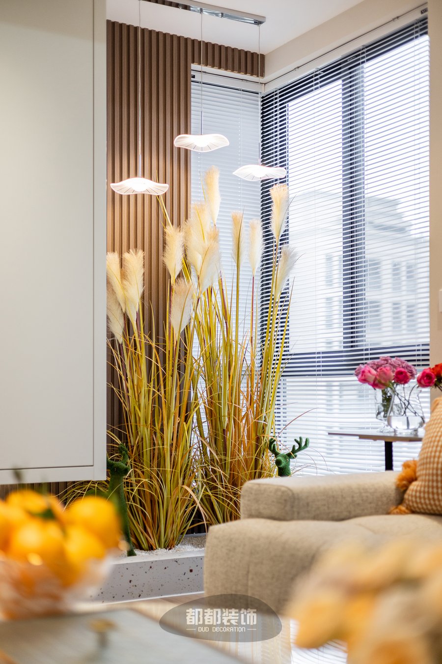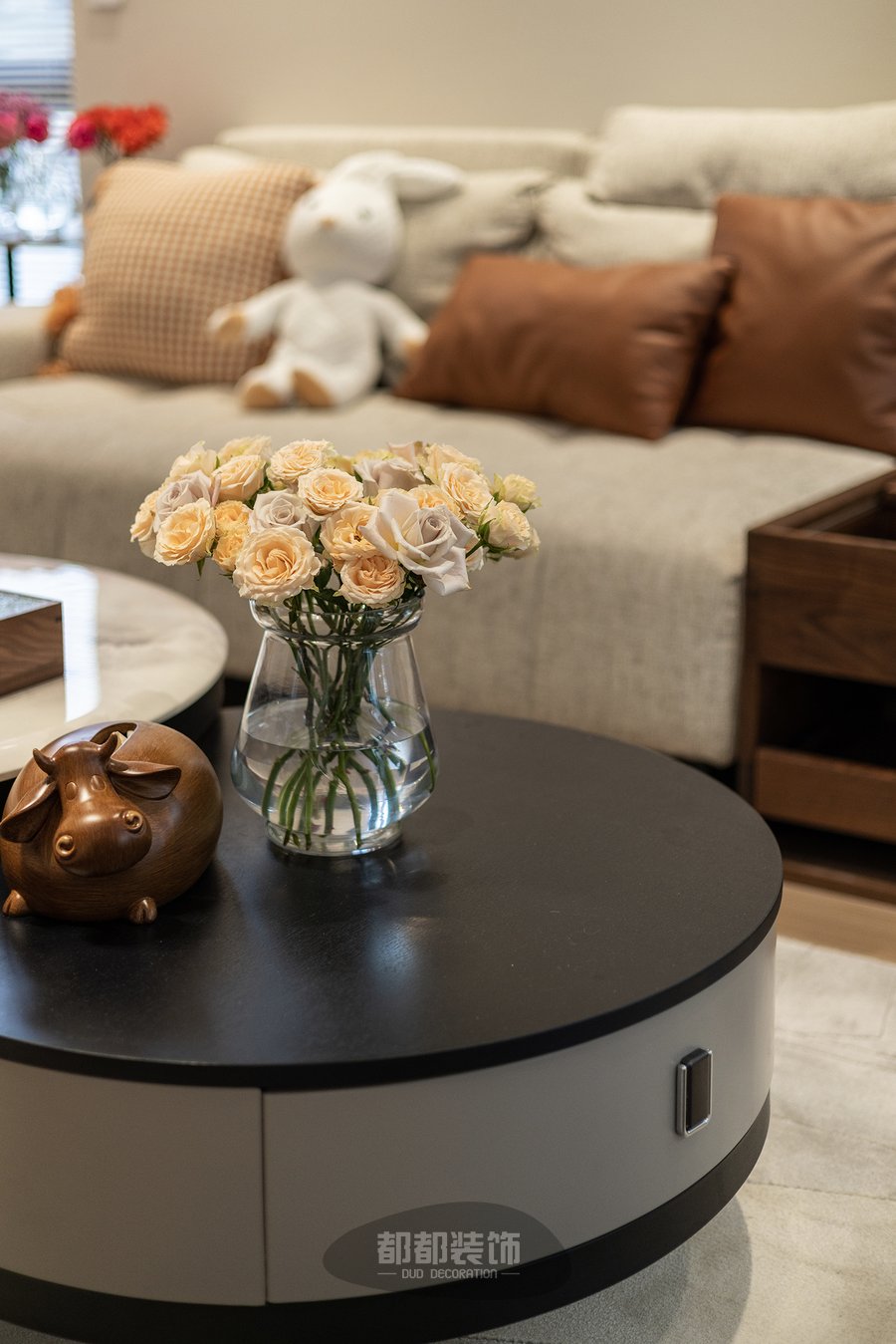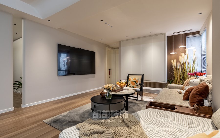 沙发一侧的走廊安装收纳柜,再多凌乱也能统统装进去,黑色极窄边长虹玻璃不仅遮住了收纳柜的凌乱,极简的气质也抬高了整个客厅的颜值。弧形的阳台垭口处理得干净利落,法式的浪漫与温柔,在这里极尽挥散。