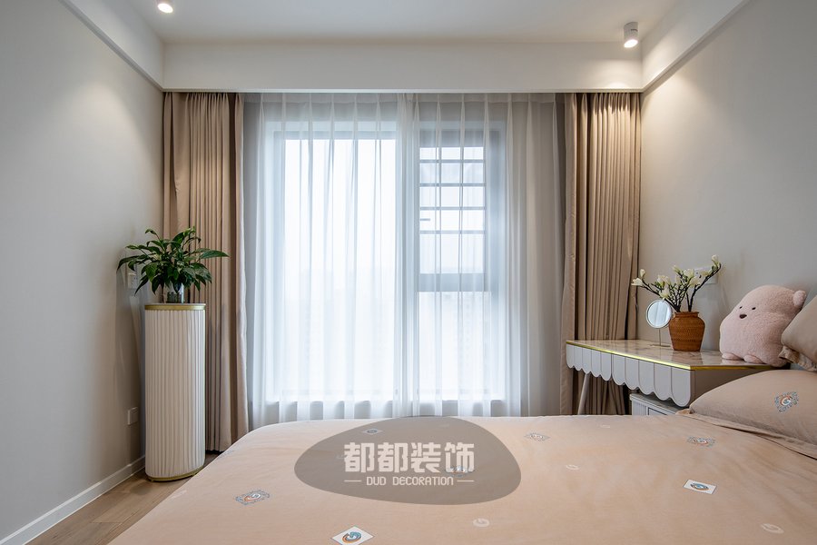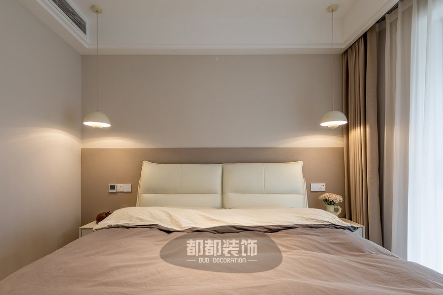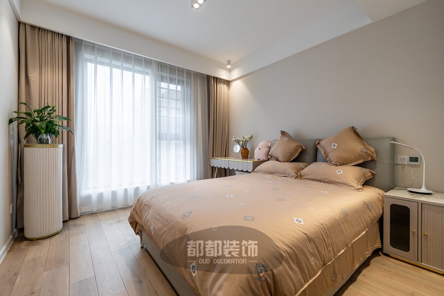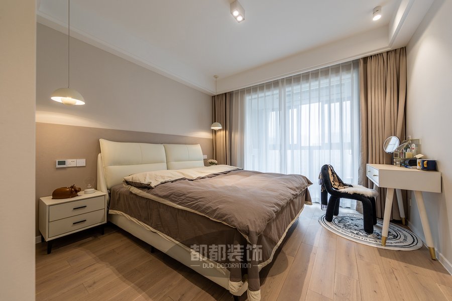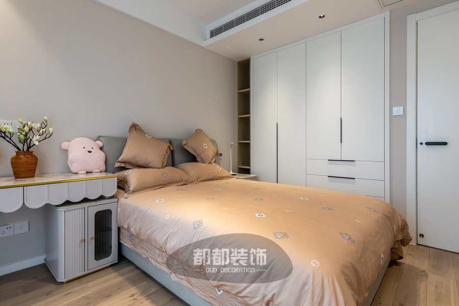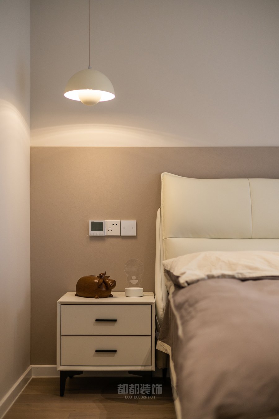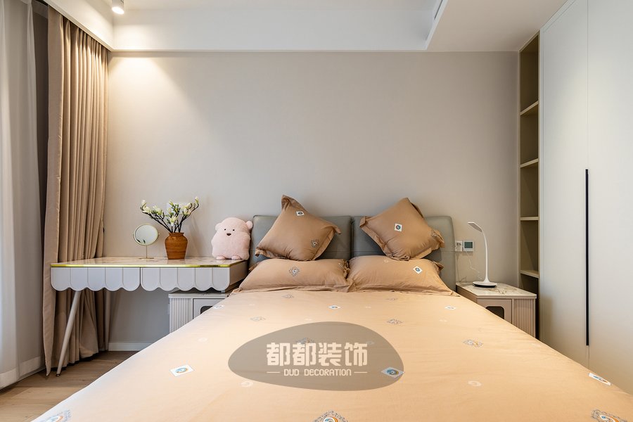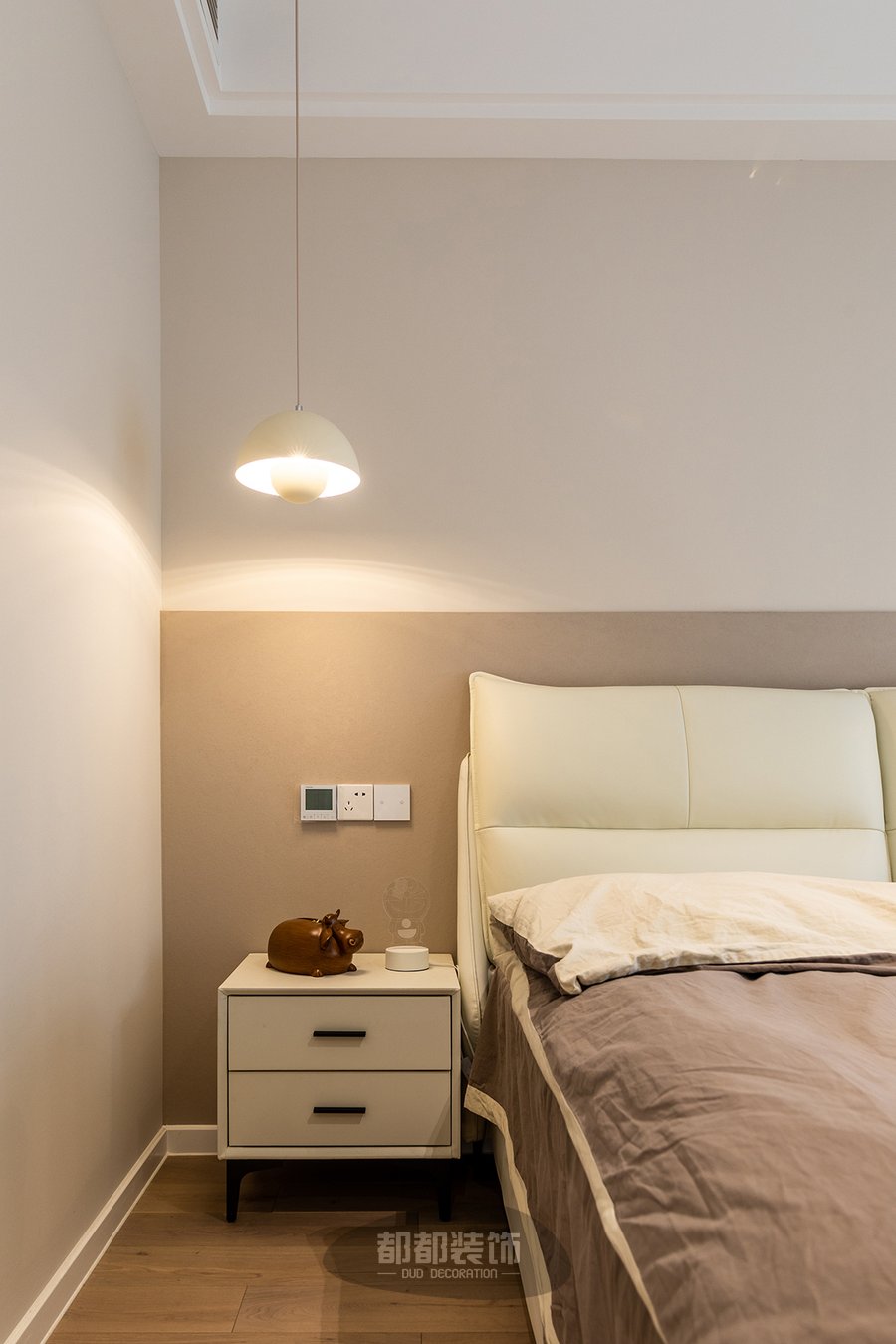 卧室对成年人来说不仅是一个休息的场所,更是能够放松精神、找回自己的伊甸园。设计师按照苏女士的喜好,打造出一个温馨的奶油风主卧。墙面是奶茶色与奶油色乳胶漆拼接,简单却又不单调,搭配同色床品,柔软蓬松的织物仿佛能把人狠狠拉进一场甜美与梦幻交织的梦里。