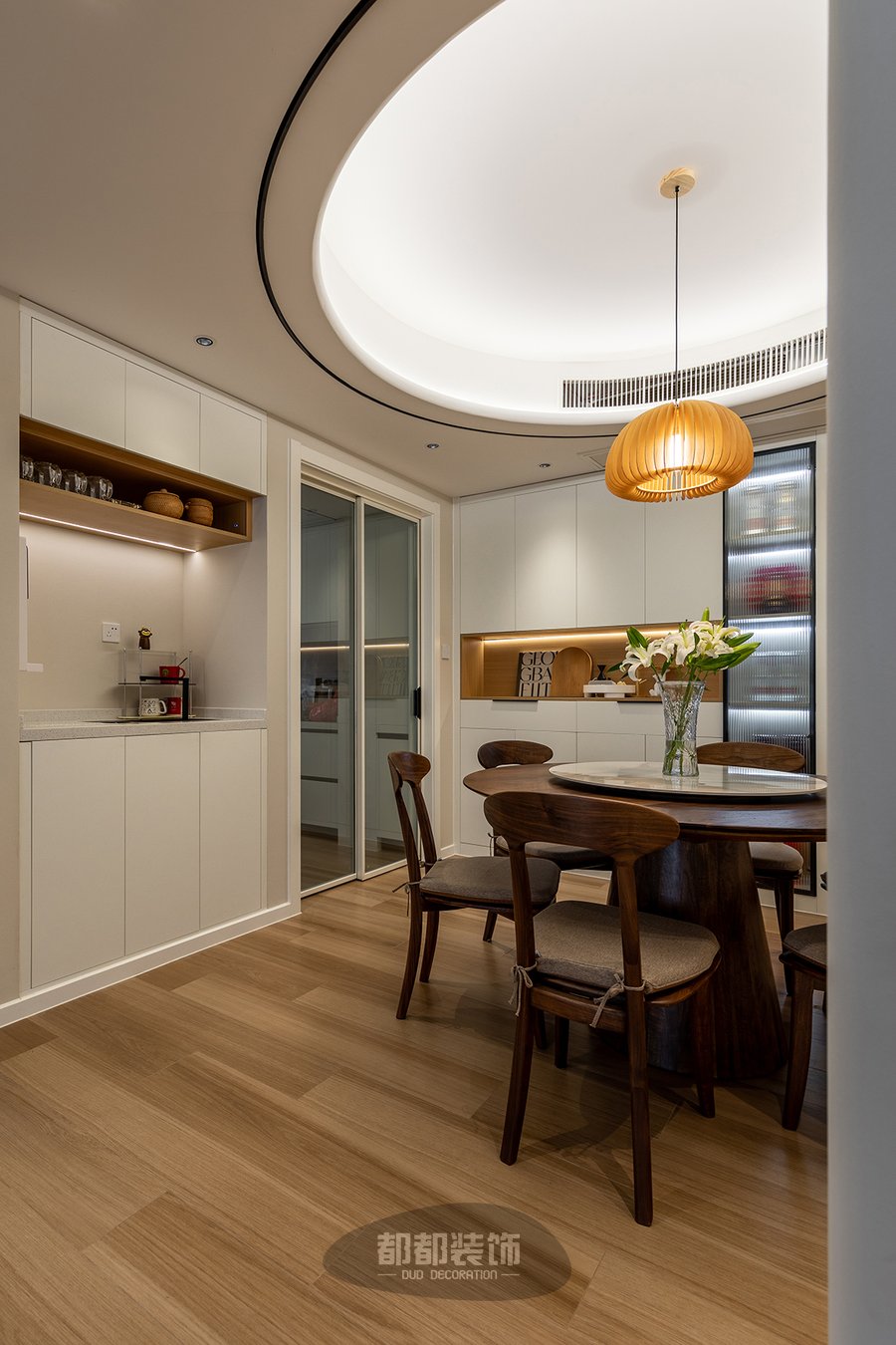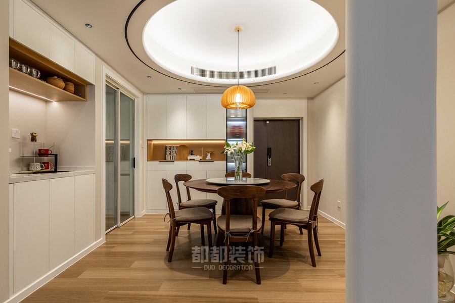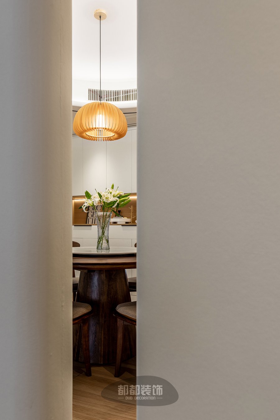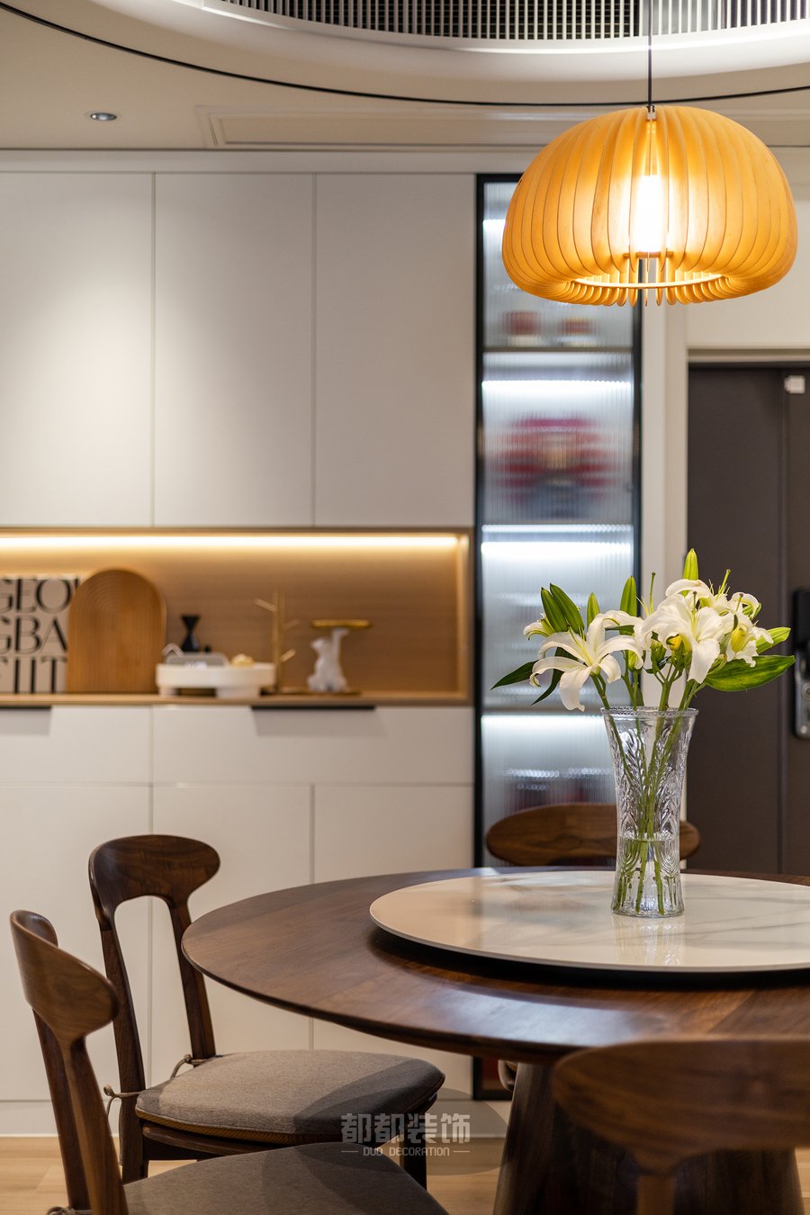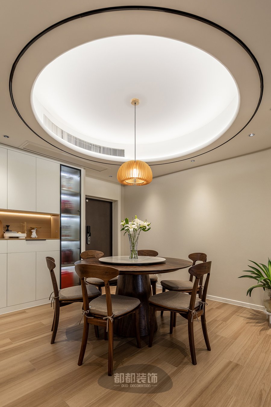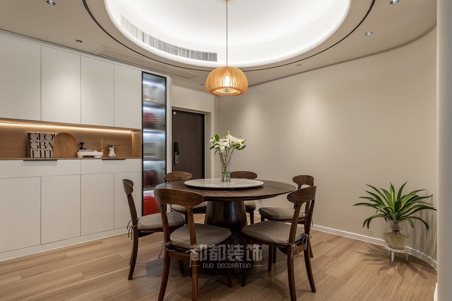 鉴于餐厅半圆角的布局,设计师为苏女士选了一个圆形的黑色樱桃木餐桌,细心的女主人还为同款餐椅配上了棉麻坐垫,圆形挑空吊顶不会压制层高,还让整个餐厅看上去设计感更足,木制品元素的大量使用与暖黄色灯光的搭配,临摹出一个温暖的家。