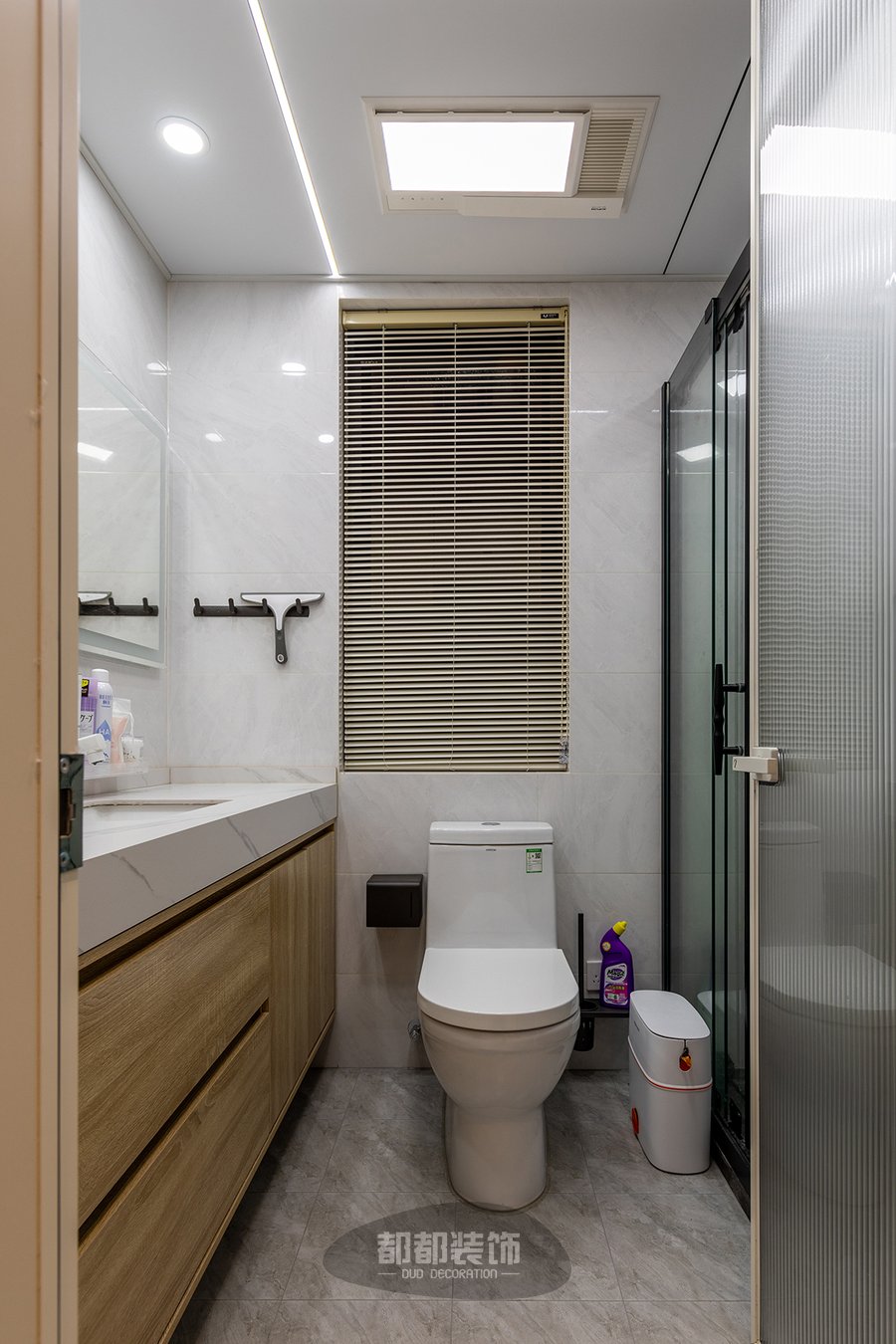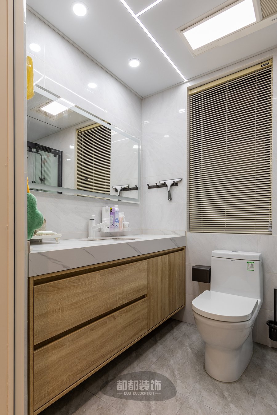 卫生间抛去全瓷片的传统装饰,洗手台下置储物柜运用了大面积的原木拼贴,与全屋整体风格保持一致,在视觉上形成延续性金属黄铜色百叶帘轻奢感十足,加长洗手台增强功能性。。干湿分离系统不仅在使用时舒适感十足,也大大减少清洁时的麻烦。