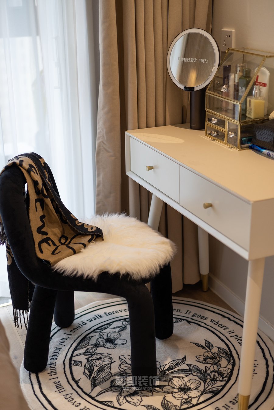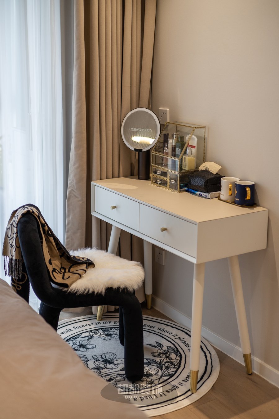 角落的1㎡空间可千万别浪费,一张小桌一个椅子就是一个位置绝佳的梳妆台。自带灯光的镜子是女孩子化妆的神器,金边透明亚克力收纳盒精致大气,也是防止落灰大一把好手。黑色金丝绒软包凳子+白色长毛坐垫,搭配圆形素描风小地毯,1㎡打造极致潮流感。