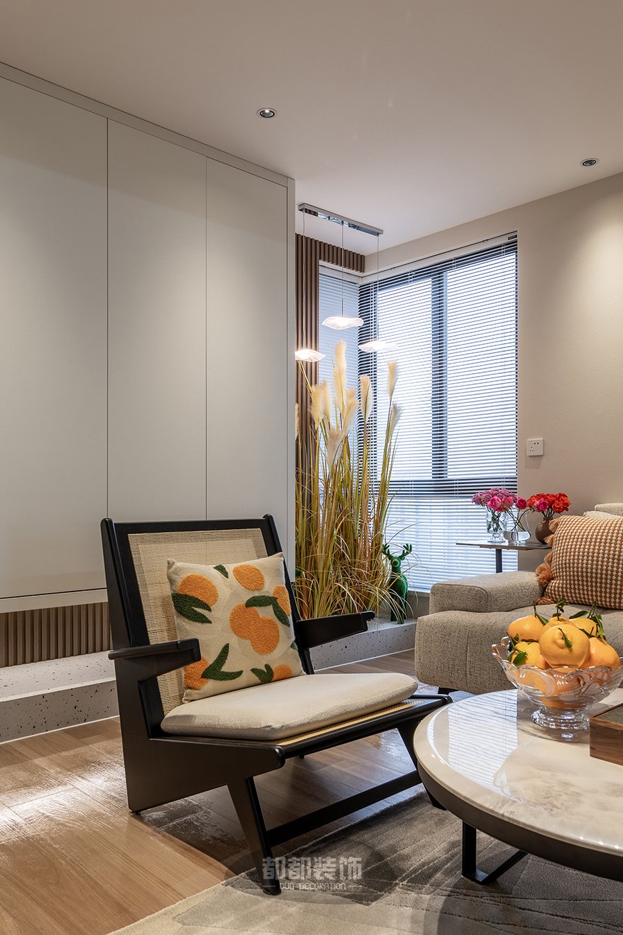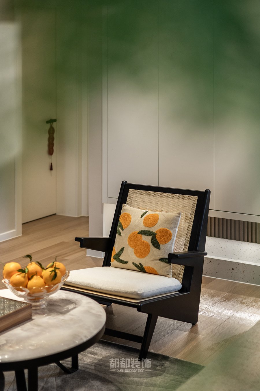 藤编木质单人椅质感满满,可爱橙子抱枕与橙子果盘相映成趣,仿佛下一秒酸甜冰爽的橙汁就要迸发出来,活力十足!