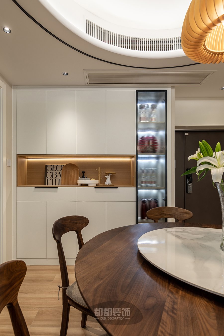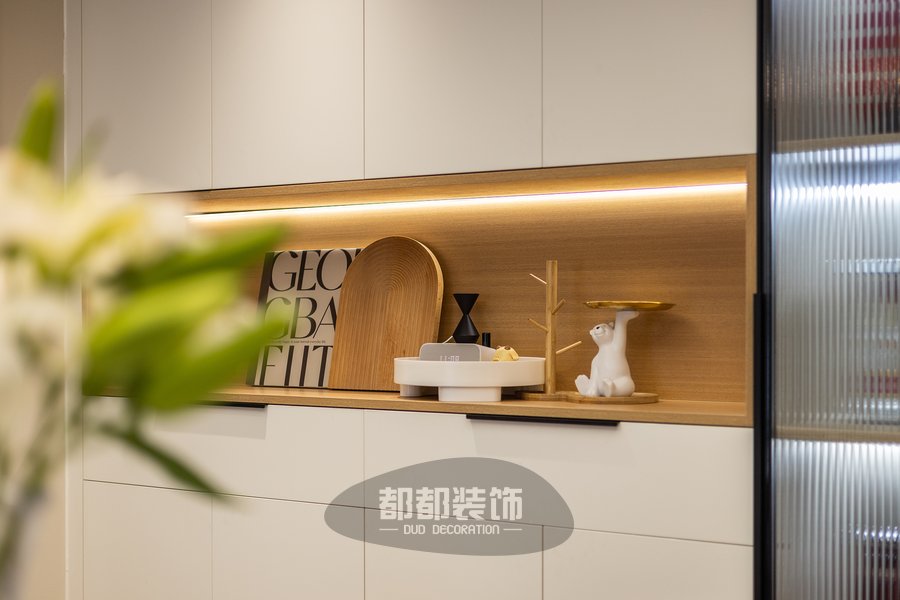 入户及餐厅,玄关柜亦为餐边柜,白色+原木色柜体做成中空,摆放上北极熊杯架托盘,实用性与颜值并重。不常用的锅具餐具收纳进客厅同款长虹玻璃柜中。